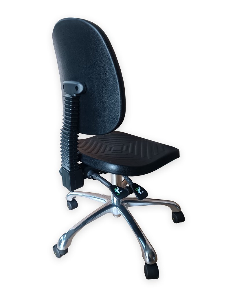 Pracovná stolička so sedákom a operadlom z PUR peny spĺňajúca normy pre antistatické prostredie s robustným krížom z hliníka.Stolička s kruhovou podperou pre nohy, klzáky na zaistenie stability a bezpečnosti s nosnosťou 130 kg.