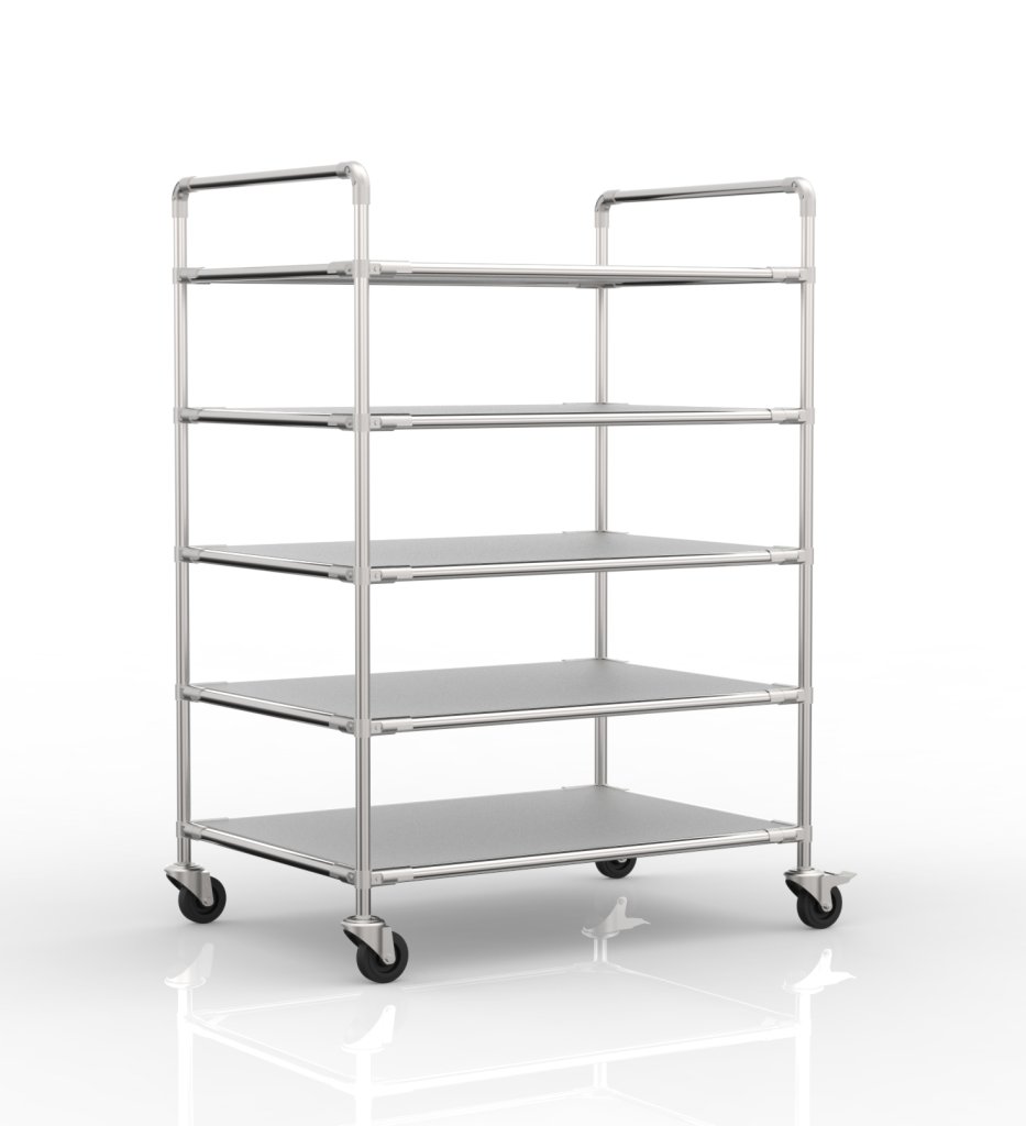 Regálový vozík na prepravky s piatimi šikmými policami je praktickým pomocníkom na manipuláciu vo výrobných firmách a logistických centrách, najmä v oblasti e-commerce. Súčasťou vozíka sú dve otočné kolieska s brzdou a dve otočné kolieska bez brzdy s priemerom 100 mm. Prednosťou týchto koliesok je nízky valivý odpor a vďaka tomu komfortná manipulácia. Konfiguráciu koliesok je možné zmeniť podľa požiadaviek zákazníka. Vozík je tiež vybavený ergonomickou rukoväťou pre ľahšiu a komfortnejšiu manipuláciu. Celková nosnosť 300 kg, nosnosť na polici 60 kg. Rozmery 1876 x 1366 x 861 mm.