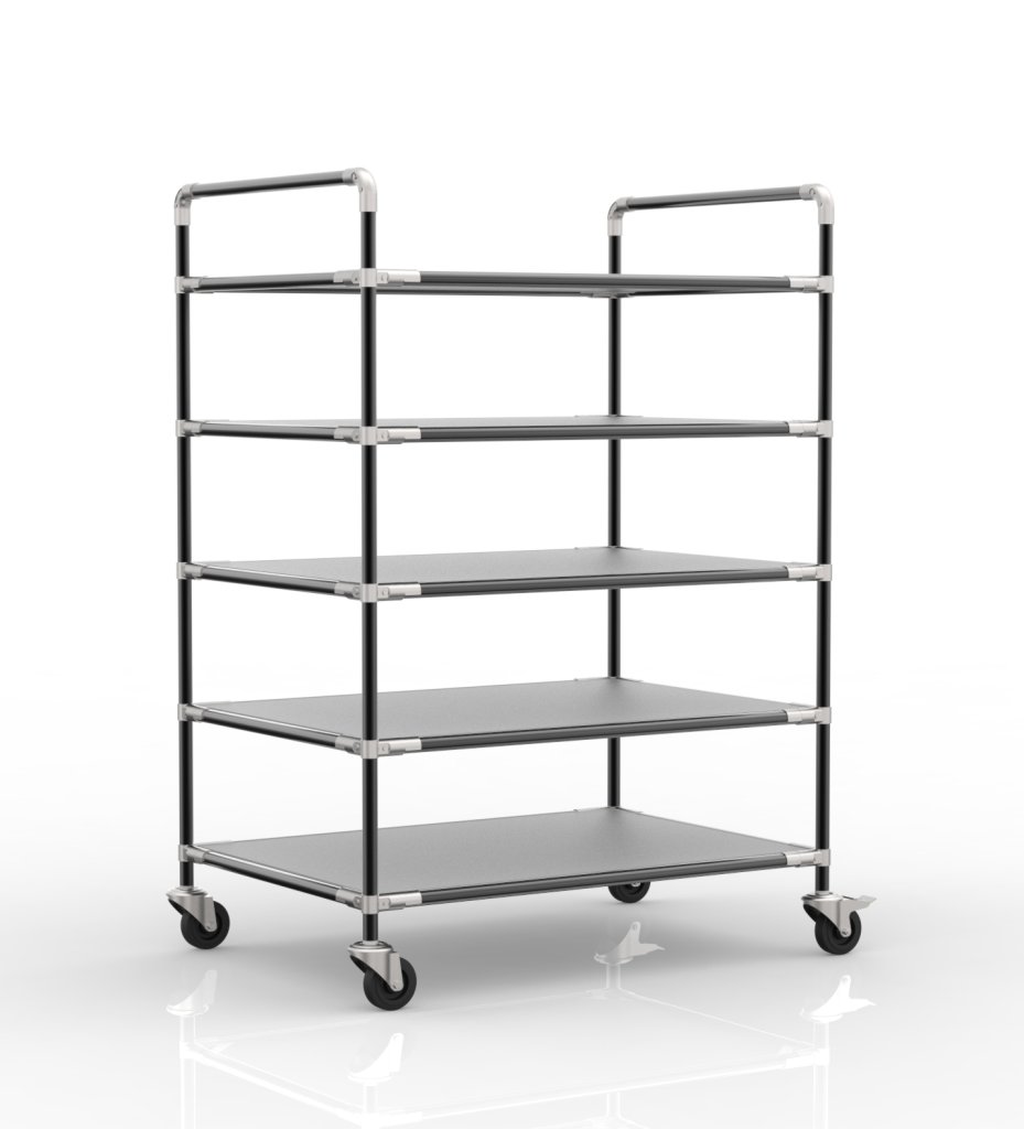 Regálový vozík na prepravky s piatimi šikmými policami je praktickým pomocníkom na manipuláciu vo výrobných firmách a logistických centrách, najmä v oblasti e-commerce. Súčasťou vozíka sú dve otočné kolieska s brzdou a dve otočné kolieska bez brzdy s priemerom 100 mm. Prednosťou týchto koliesok je nízky valivý odpor a vďaka tomu komfortná manipulácia. Konfiguráciu koliesok je možné zmeniť podľa požiadaviek zákazníka. Vozík je tiež vybavený ergonomickou rukoväťou pre ľahšiu a komfortnejšiu manipuláciu. Celková nosnosť 300 kg, nosnosť na polici 60 kg. Rozmery 1876 x 1366 x 861 mm.