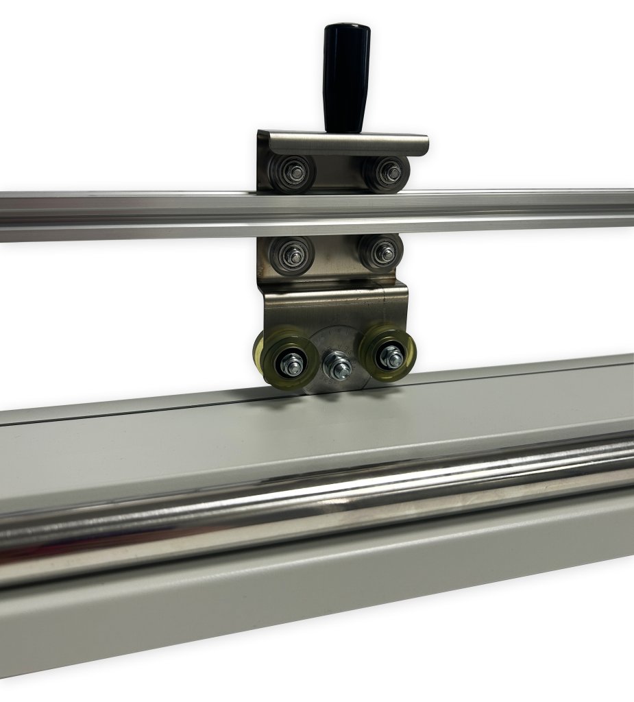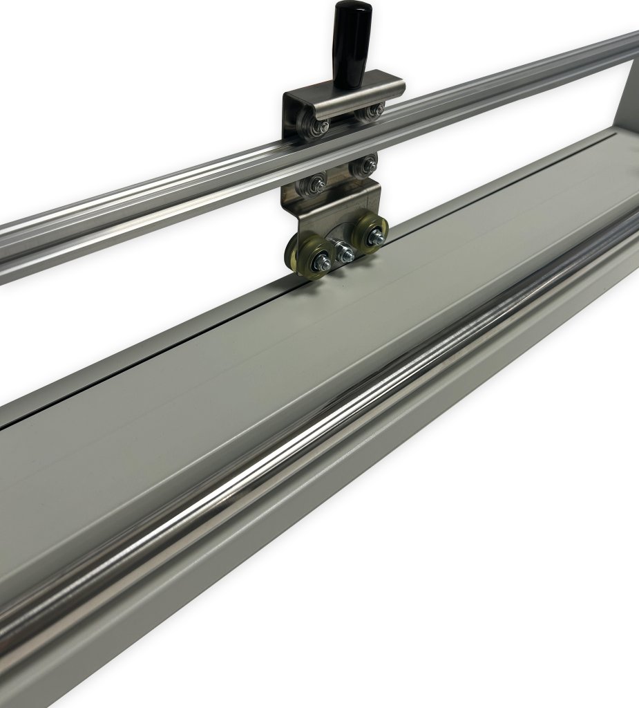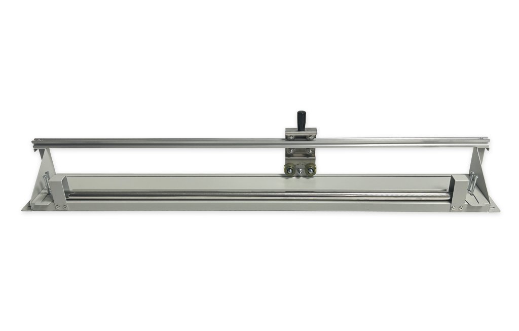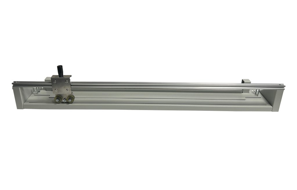 Vodorovný rezací stojan na rôzne baliace materiály. Rozmery výška 1430 x šírka 935 x dĺžka 1000 mm. Farba konštrukcie šedá.