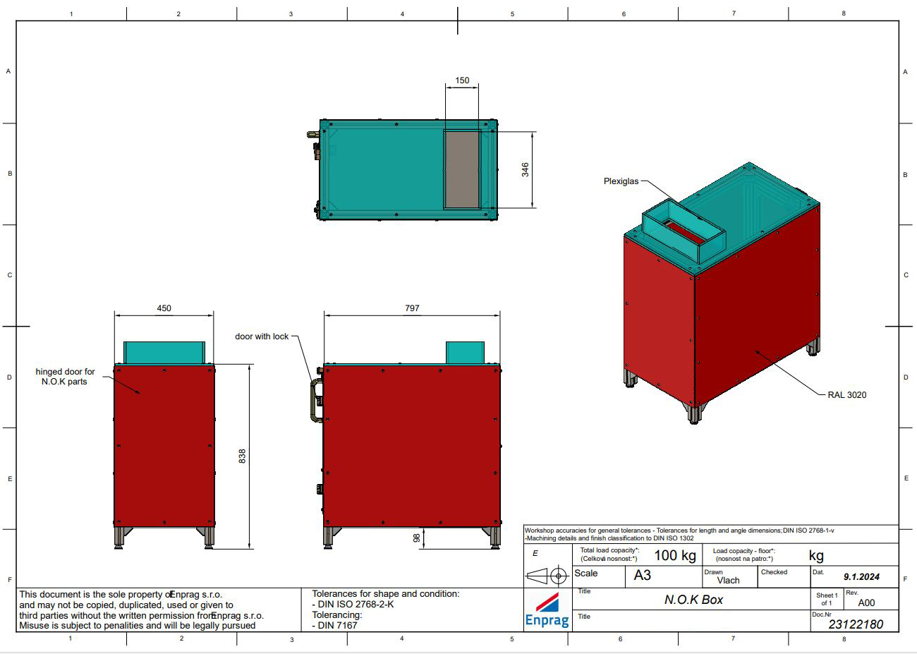 Box vhodný na skladovanie NOK (Not Okay) súčiastok. Robustná a kvalitná konštrukcia zaistí nielen bezpečné uloženie, ale aj prepravu NOK súčiastok. Horná časť konštrukcie je vyrobená z priehľadného plexiskla, ktoré umožňuje ľahké monitorovanie obsahu, a je vybavená otvorom pre ľahké vhodenie súčiastok. Základná konštrukcia je tvorená z hliníkových profilov.
