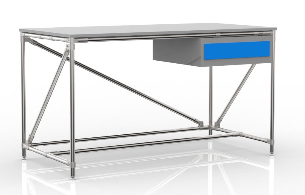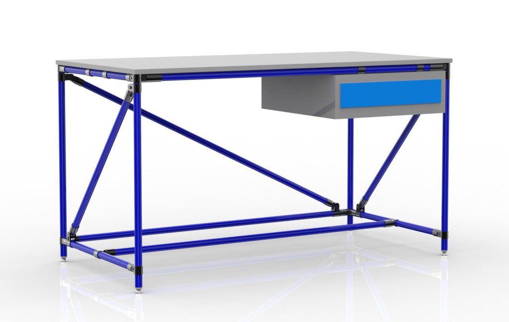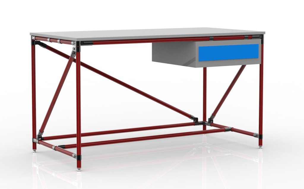 Dielenský stôl z trubkového stavebnicového systému. Súčasťou stola je obojstranne laminovaná pracovná doska, stolový kontajner so zásuvkou a štyri nastaviteľné nožičky. Nosnosť pri rovnomernom zaťažení 100 kg. Rozmery 850 x 1500 x 750 mm.