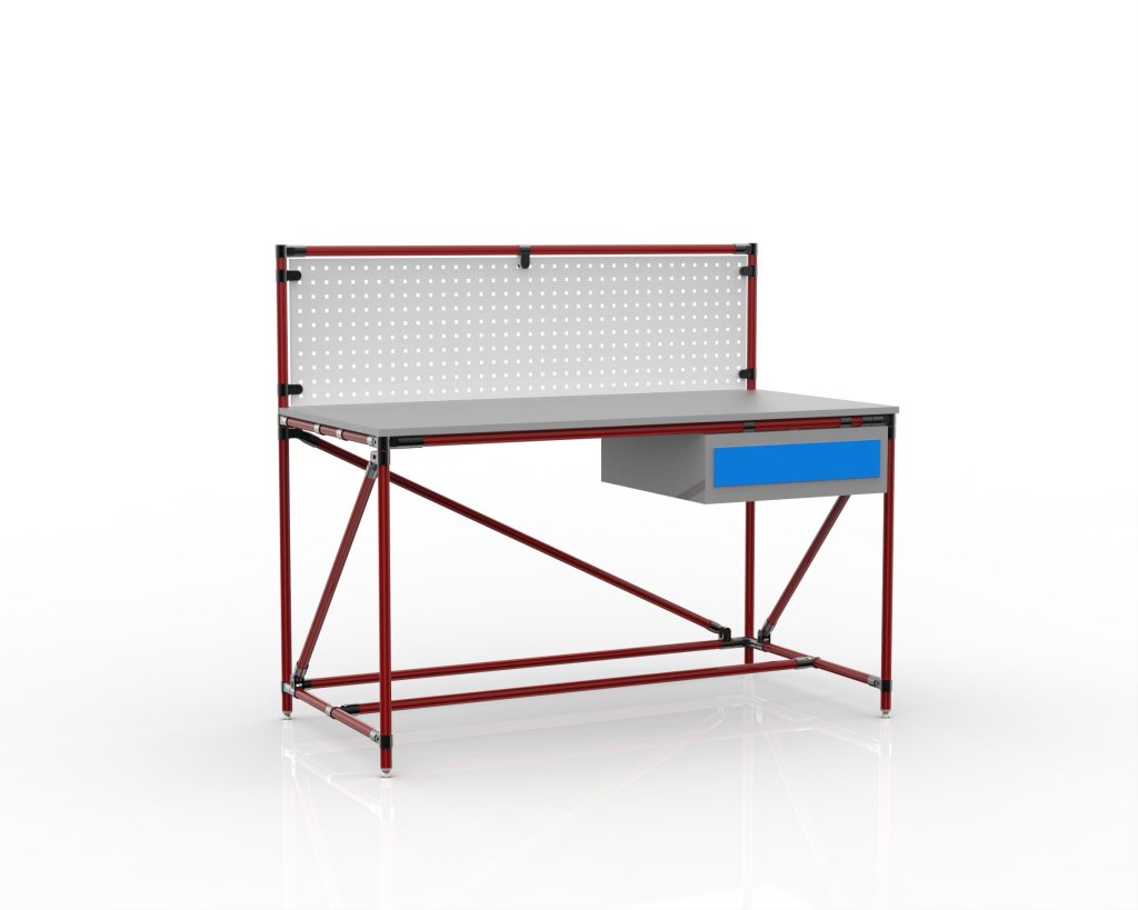 Dielenský stôl s perfopanelom z trubkového stavebnicového systému. Súčasťou stola je drevotriesková pracovná doska obojstranne laminovaná hrúbkou 18 mm, stolový kontajner s jednou zásuvkou, perfopanel na zavesenie náradia či boxov a štyri nastaviteľné nožičky. Nosnosť pri rovnomernom zaťažení 100 kg. Rozmery 1282 x 1500 x 750 mm.