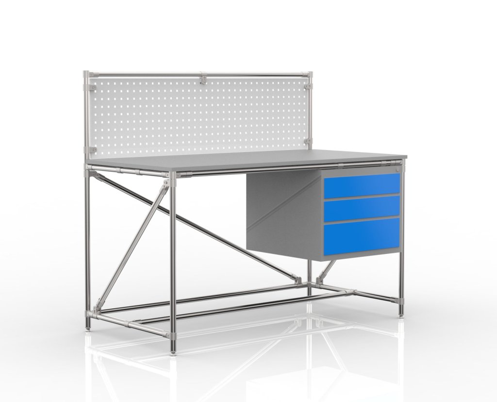 Dielenský stôl s perfopanelom z trubkového stavebnicového systému. Súčasťou stola je drevotriesková pracovná doska obojstranne laminovaná hrúbkou 18 mm, stolový kontajner s tromi zásuvkami, perfopanel na zavesenie náradia či boxov a štyri nastaviteľné nožičky. Nosnosť pri rovnomernom zaťažení 100 kg. Rozmery 1282 x 1500 x 750 mm.