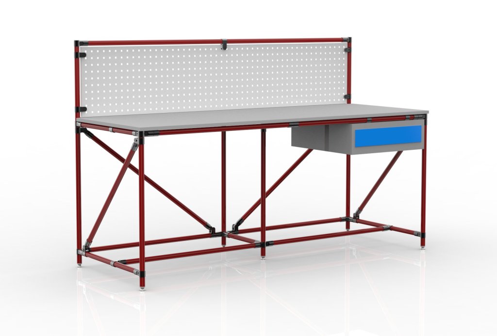 Dielenský stôl s perfopanelom z trubkového stavebnicového systému. Súčasťou stola je drevotriesková pracovná doska obojstranne laminovaná hrúbkou 18 mm, stolový kontajner s tromi zásuvkami, perfopanel na zavesenie náradia či boxov a štyri nastaviteľné nožičky. Nosnosť pri rovnomernom zaťažení 100 kg. Rozmery 1282 x 2000 x 750 mm.