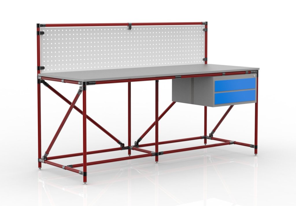Výškovo nastaviteľný stôl z trubkového stavebnicového systému. Súčasťou stola je lamino doska hrúbky 18 mm, dielenský kontajner, perfopanel na zavesenie boxov či náradia a osvetlenie. Výška pracovnej plochy nastaviteľná v rozmedzí 650 – 950 mm. Nosnosť pri rovnomernom zaťažení 150 kg. Rozmery stola 2100 x 1500 x 700 mm.