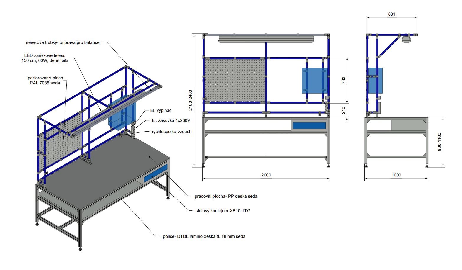 Dielenský stôl z hliníkových profilov s kontajnerom a s nástavbou z trubkového systému ponúka prehľadné usporiadanie pracovného celý popis a parametre