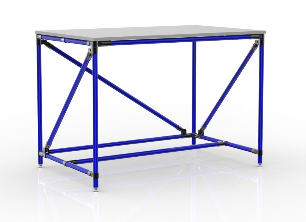 Montážny stôl z trubkového konštrukčného systému s pracovnou laminátovou doskou s hrúbkou 18 mm a štyrmi nastaviteľnými nožičkami. celý popis a parametre