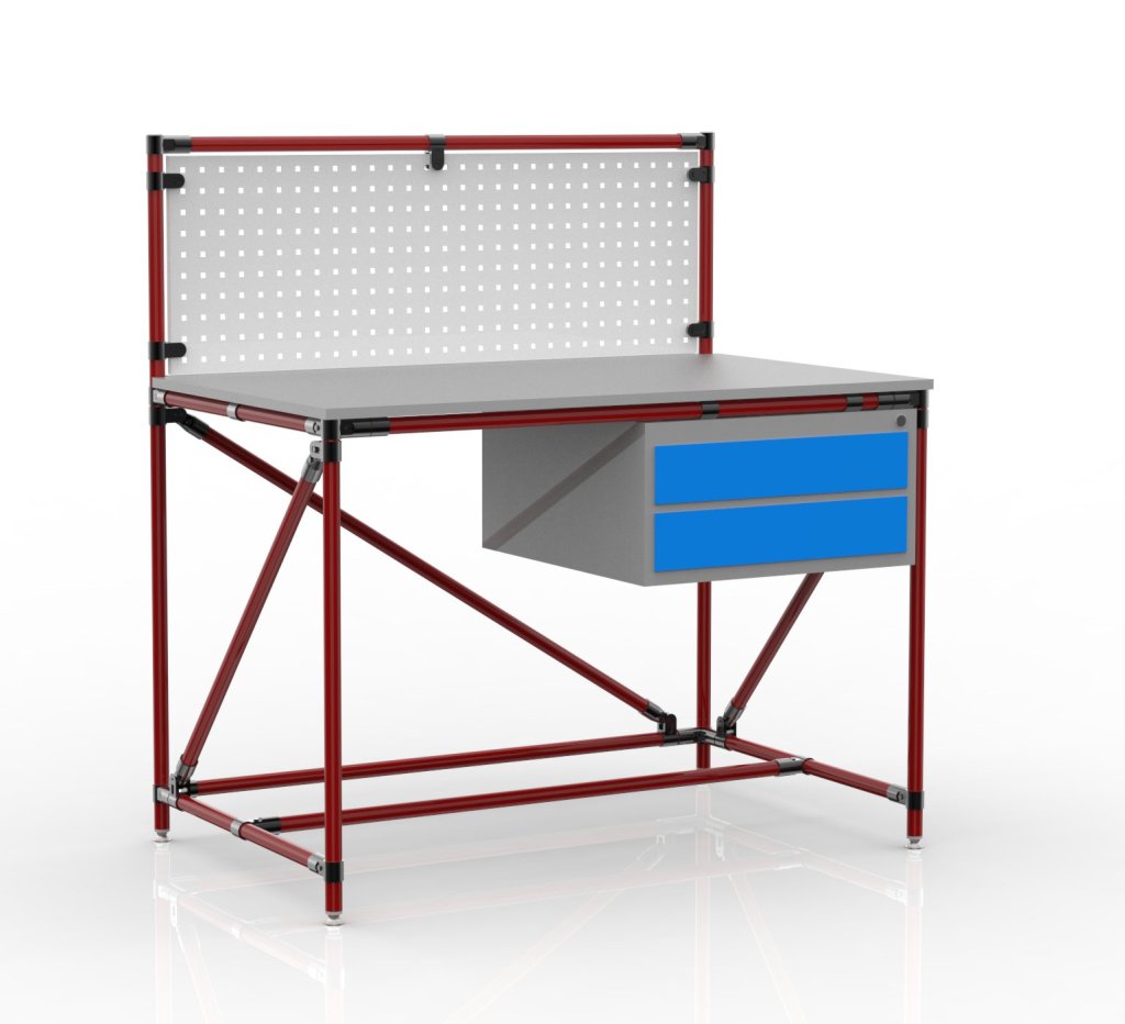 Dielenský stôl s perfopanelom z trubkového stavebnicového systému. Súčasťou stola je pracovná lamino doska, stolový kontajner s dvoma zásuvkami, perfopanel a štyri nastaviteľné nožičky. Nosnosť pri rovnomernom zaťažení 100 kg. Rozmery 1282 x 1200 x 750 mm.