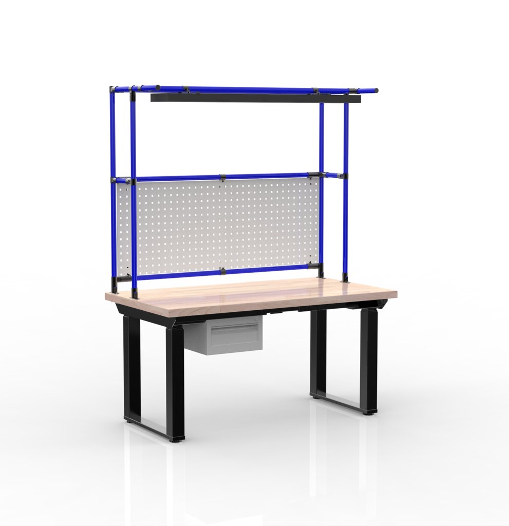 Elektricky výškovo nastaviteľný baliaci pracovný stôl s pracovnou doskou z bukovej škárovky. Súčasťou stola je kontajner s jednou zásuvkou, perforovaný panel na zavesenie boxov alebo náradia a LED osvetlenie. Výška pracovnej plochy je nastaviteľná v rozmedzí 700 - 1350 mm. Nosnosť pri rovnomernom zaťažení je 250 kg. Rozmery 1800 - 2450 x 1400 x 750 mm.