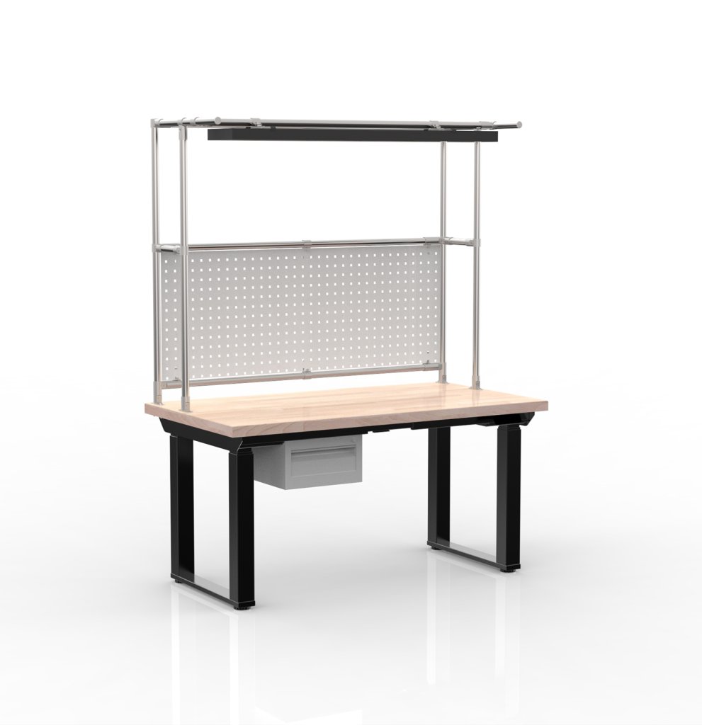 Elektricky výškovo nastaviteľný baliaci pracovný stôl s pracovnou doskou z bukovej škárovky. Súčasťou stola je kontajner s jednou zásuvkou, perforovaný panel na zavesenie boxov alebo náradia a LED osvetlenie. Výška pracovnej plochy je nastaviteľná v rozmedzí 700 - 1350 mm. Nosnosť pri rovnomernom zaťažení je 250 kg. Rozmery 1800 - 2450 x 1400 x 750 mm.