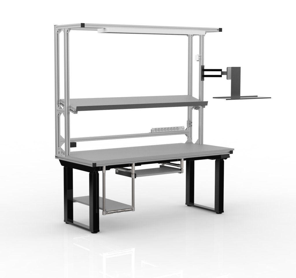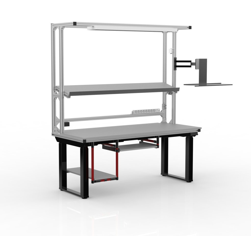 Elektricky výškovo nastaviteľný pracovný stôl s nadstavbou z hliníkových profilov. Současťou stola je pracovná lamino doska s hrúbkou 18 mm, dve podvesné poličky, držiak na monitor a klávesnicu, nastaviteľná polica so zarážkou proti prepadnutiu, LED osvetlenie. Výška pracovnej plochy nastaviteľná v rozmedzí 717 - 1367 mm. Celková nosnosť pri rovnomernom zaťažení je 200 kg, nosnosť police 50 kg, nosnosť pracovnej plochy 150 kg. Rozmery 2000 - 2650 x 1750 x 750 mm.