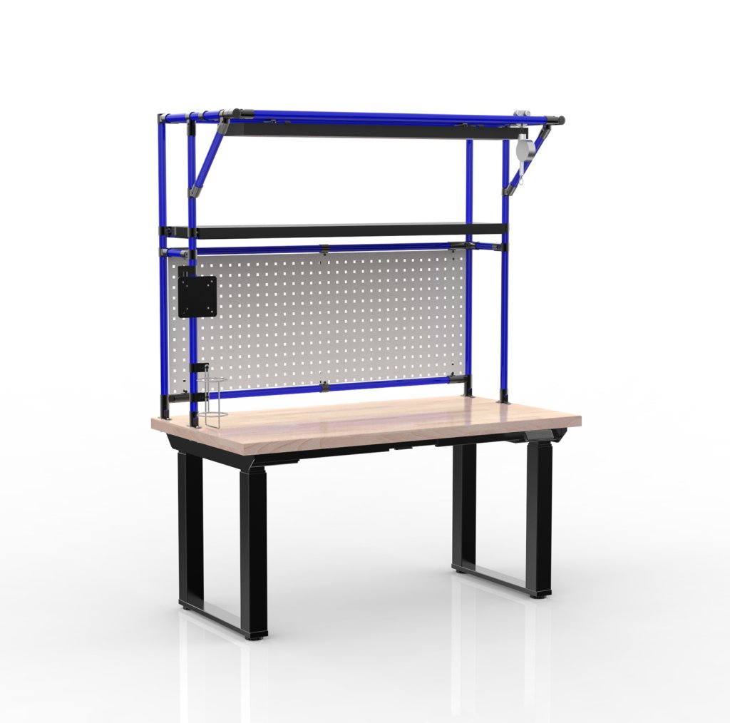 Elektricky výškovo nastaviteľný pracovný stôl s pracovnou doskou z bukovej škárovky. Súčasťou stola je perforovaný panel na zavesenie boxov alebo náradia, pozinkovaná polica, držiak na monitor, držiak na 2l PET fľaše a LED osvetlenie. Výška pracovnej plochy je nastaviteľná v rozmedzí 700 - 1350 mm. Nosnosť pri rovnomernom zaťažení je 250 kg. Rozmery 1800 - 2450 x 1400 x 750 mm.