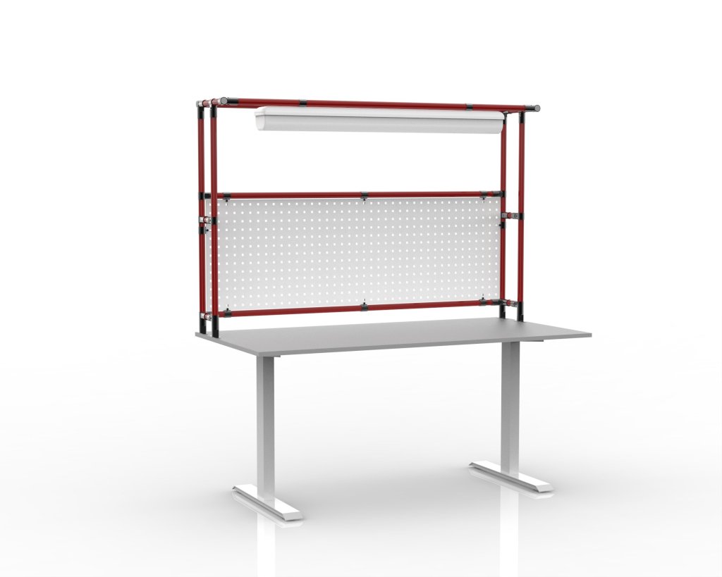 Výškovo nastaviteľný stôl s nadstavbou z trubkového stavebnicového systému a perfopanelom. Rozsah nastavenia výšky 726 - 1226 mm. celý popis a parametre