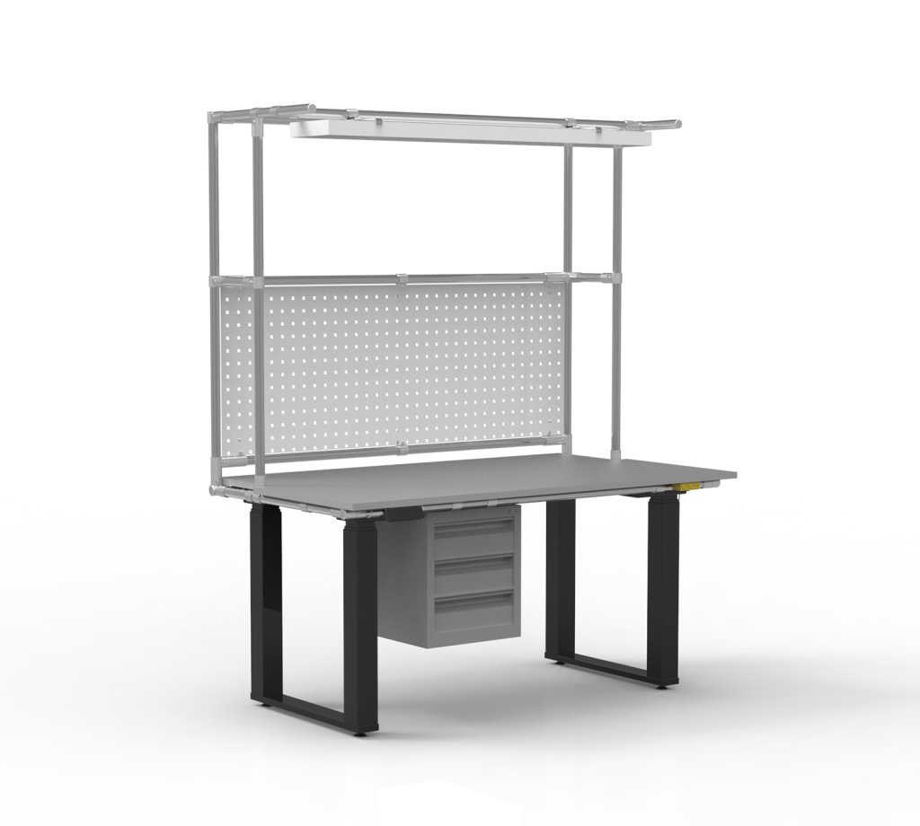 Ergonomický ESD stôl pre elektrostaticky chránené pracoviská s praktickou nadstavbou z rúrkového systému. Súčasťou stola je LED osvetlenie, perfopanel a kontajner s troma zásuvkami. Stôl je vybavený intuitívnym ovládačom s možnosťou uloženia troch prednastavených výšok, čo uľahčuje ergonomické nastavenie pracovnej plochy v rozsahu 680 – 1330 mm.