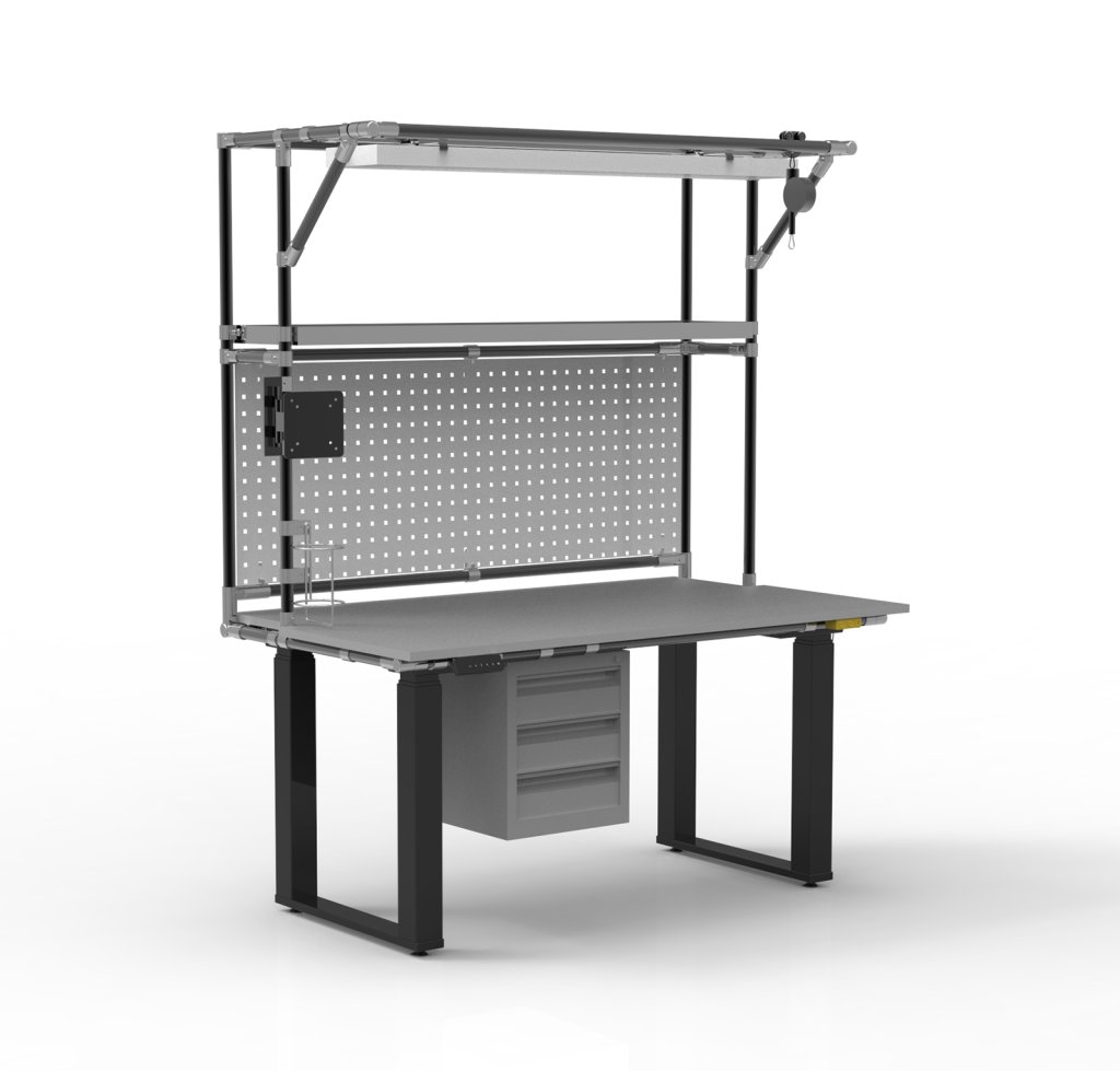 Ergonomický ESD stôl pre elektrostaticky chránené pracoviská s praktickou nadstavbou z rúrkového systému. Súčasťou stola je LED osvetlenie, perfopanel a kontajner s tromi zásuvkami. Stôl je vybavený intuitívnym ovládačom s možnosťou uloženia troch prednastavených výšok, čo uľahčuje ergonomické nastavenie pracovnej plochy v rozsahu 680 – 1330 mm.