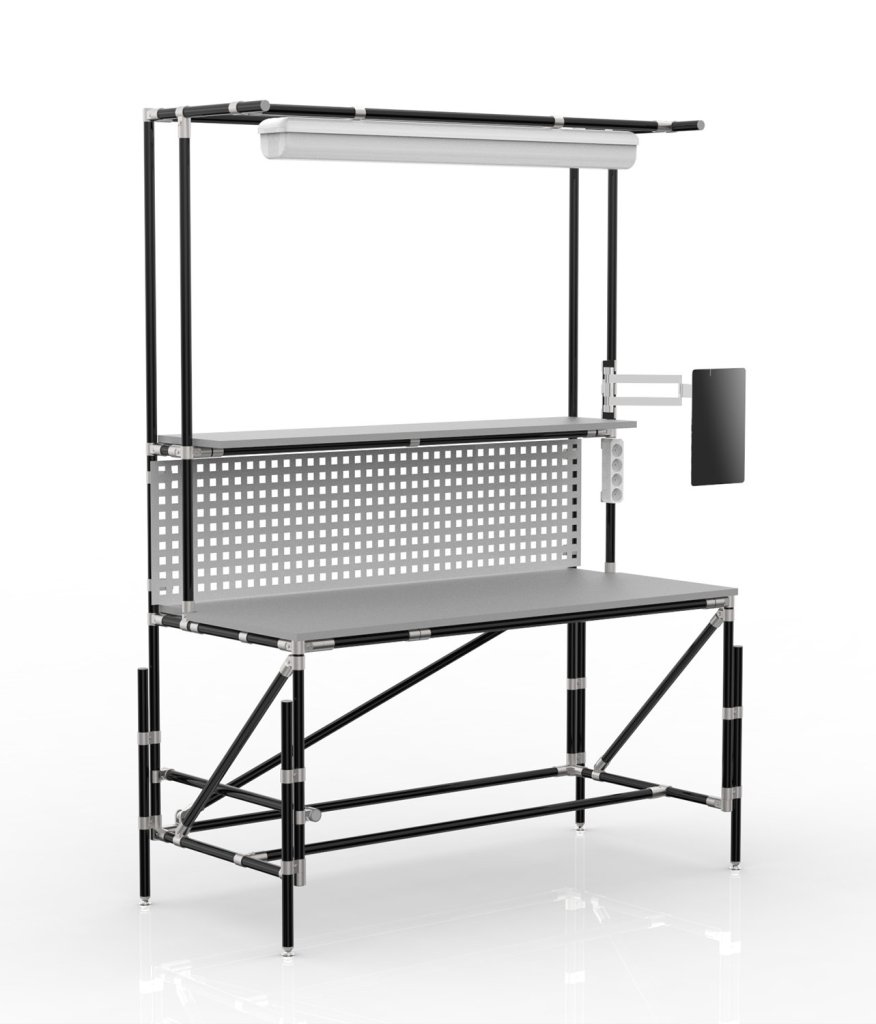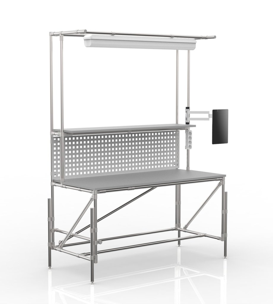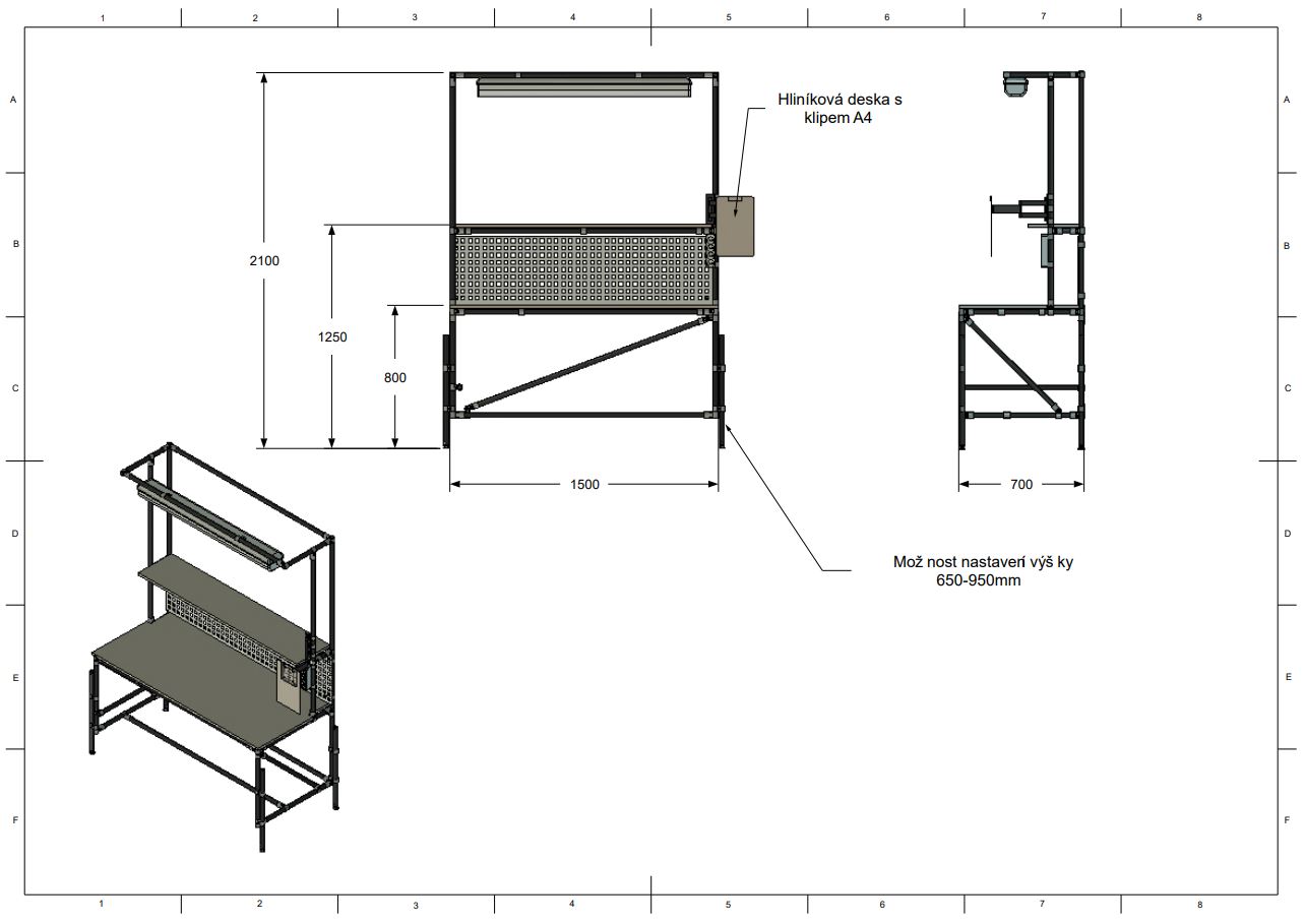 Výškovo nastaviteľný antistatický stôl z trubkového stavebnicového systému. Tento stôl je vybavený ESD lamino doskou s hrúbkou 19 mm, ktorá poskytuje spoľahlivú ochranu proti elektrostatickému výboju. Súčasťou stola je aj ESD perfopanel, ktorý umožňuje ľahké a efektívne usporiadanie nástrojov a materiálov pri zachovaní antistatických vlastností stola. Nosnosť 150 kg. Rozmery 1950 - 2250 x 1500 x 700 mm.