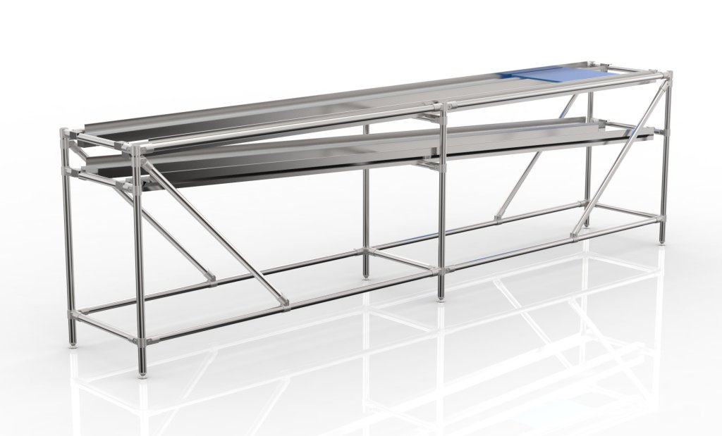 Gravitačný dopravník z rúrkového stavebnicového systému na posun materiálov. Systém využíva valčekové dráhy na presun materiálu. Vďaka spodnej valčekovej dráhe so sklonom sú prázdne plastové paletky automaticky vrátené späť na začiatok dopravníka. Nosnosť na poschodie 200 kg, celková nosnosť 400 kg. Rozmery 840 x 3003 x 503 mm.