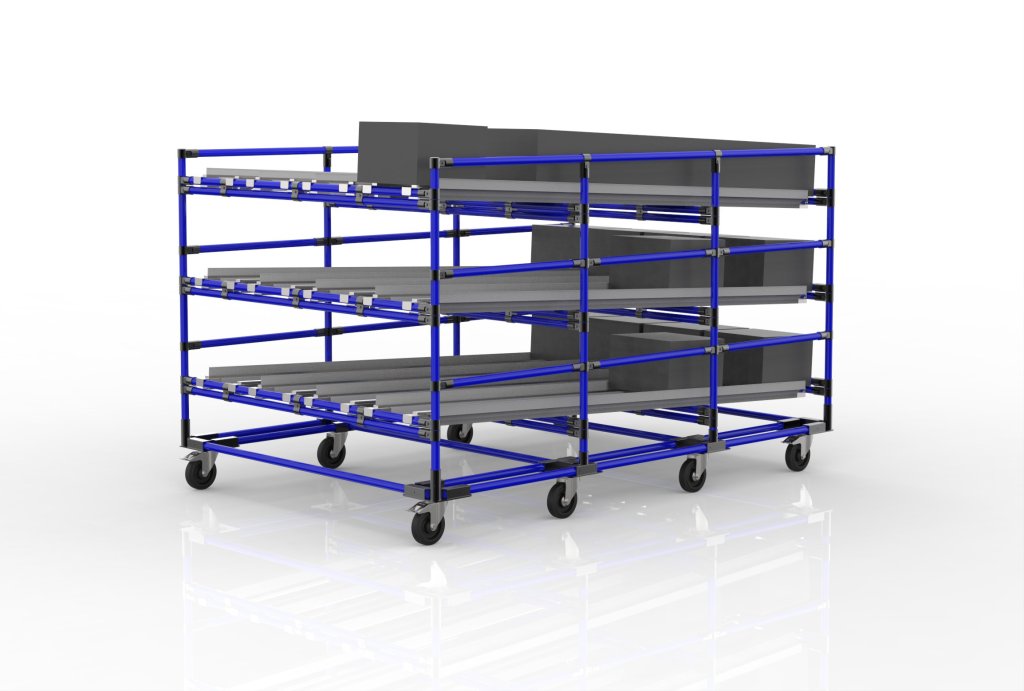 Gravitačný regál FIFO s kolieskami z trubkového stavebnicového systému. Súčasťou je systém FIFO (First in, First out), ktorý celý popis a parametre