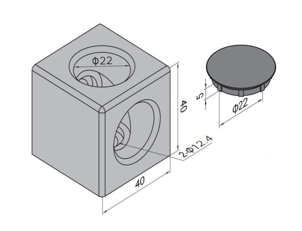 Kubická spojka pre pravouhlé spojenie 2 hliníkových profilov. Rozmery 40x40x40 mm.