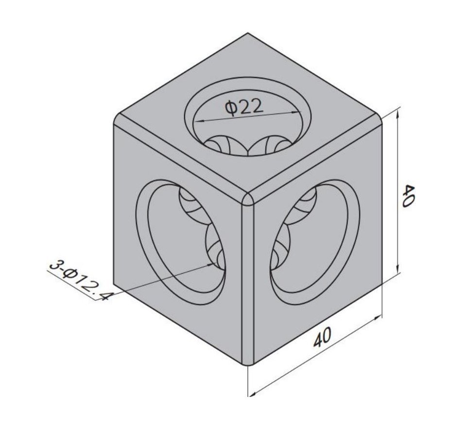 Kubická spojka pre pravouhlé spojenie 3 hliníkových profilov. Rozmery 40x40x40 mm. celý popis a parametre