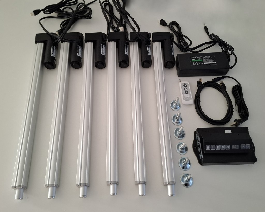 Elektrický lineárny pohon napájaný napätím 24V. Zdvihová kapacita pohonu je 3000 N. Maximálny výsuv zariadenia je 45 cm. LEG_SET 6 obsahuje 6 nôh, ovládanie, diaľkové ovládanie, napájanie, nastavovacie skrutky, napájacie káble.
