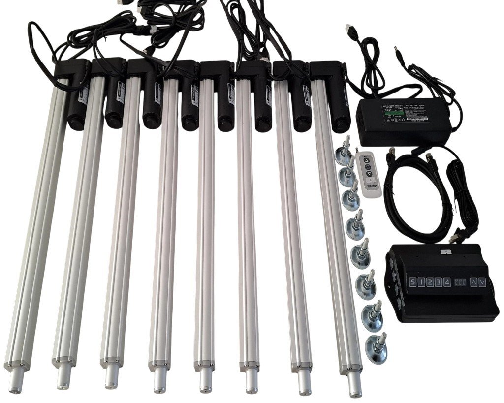 Elektrický lineárny pohon napájaný napätím 24V. Zdvihová kapacita pohonu je 3000 N. Maximálny výsuv zariadenia je 45 cm. LEG_SET 8 obsahuje 8 nôh, ovládanie, diaľkové ovládanie, napájanie, nastavovacie skrutky, napájacie káble.