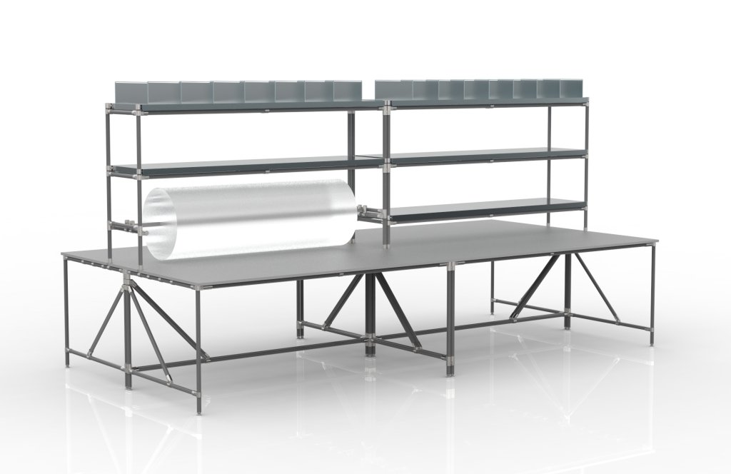 Montážne pracovisko z rúrkového stavebnicového systému. Konštrukcia sa skladá zo štyroch samostatných stolov s nadstavbou. Súčasťou konštrukcie je pracovná laminovaná doska s hrúbkou 18 mm, pozinkované police a police s deliacou priehradkou, tyč na uchytenie fólie. Po demontáži vrchnej nadstavby je možné stoly ľubovoľne rozdeliť. Celková nosnosť je 550 kg, nosnosť pracovnej dosky je 75 kg a nosnosť police je 50 kg. Rozmery 2100 x 4140 x 2000 mm.