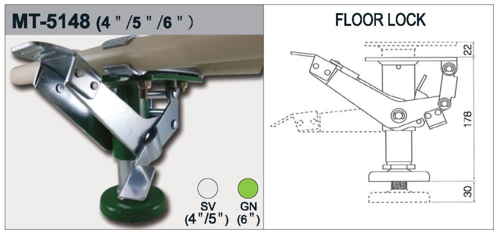 Nastaviteľná fixná noha MT-5148GN, priemer pätky 6 palcov. Výškové nastavenie 30 mm. celý popis a parametre