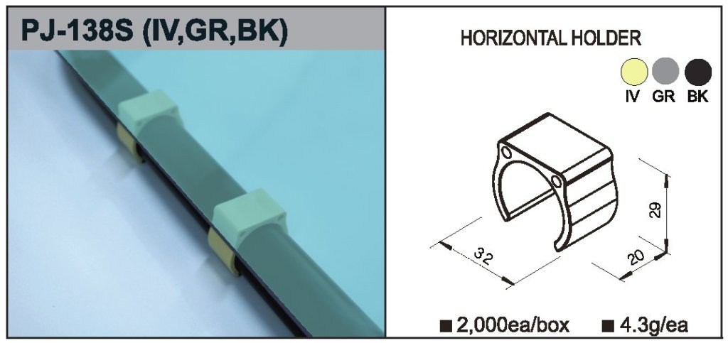 Plastová objímka typ PJ-138S, vhodná napríklad ako podpera pod policu. Farba béžová (IV), šedá (GR) alebo čierna (BK), hmotnosť 4 celý popis a parametre