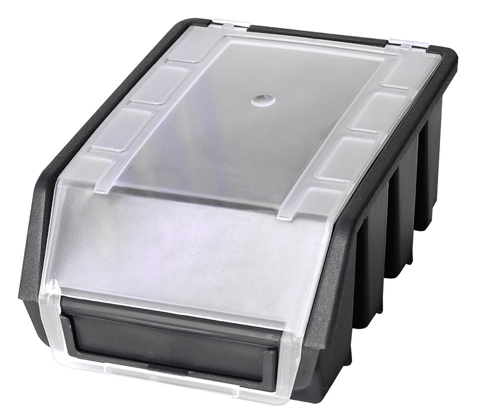 Plastové zásobníky Ergobox 2 Plus v čiernej farbe. Priehľadné veko, priestor pre štítok. Vhodné na zavesenie na plastové alebo celý popis a parametre