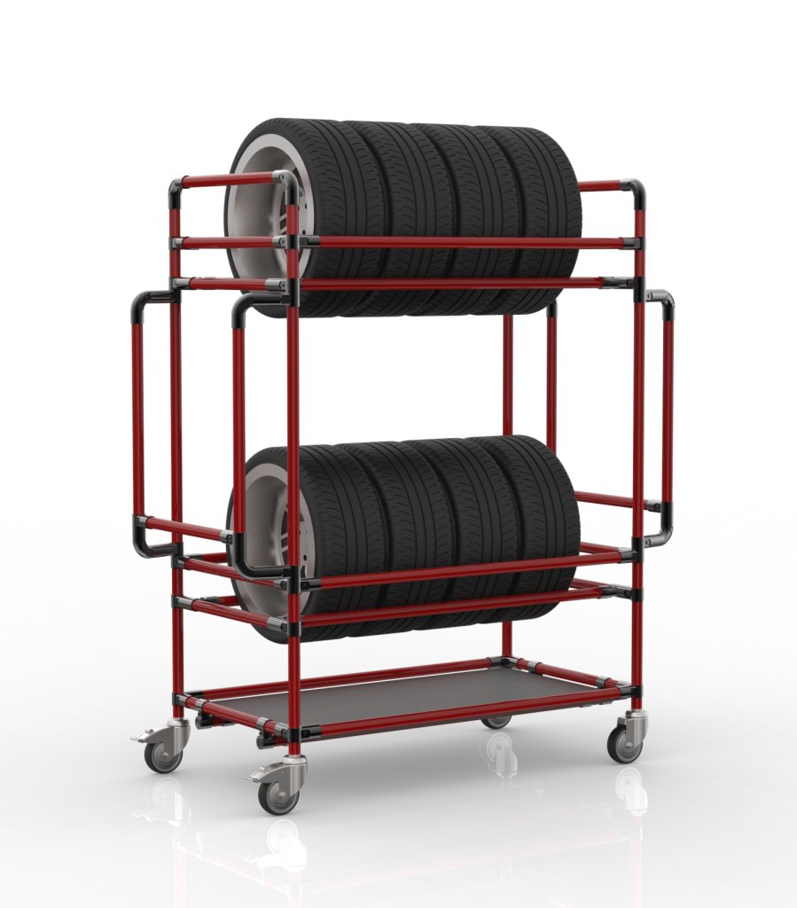 Pojazdný regál na pneumatiky z rúrkového stavebnicového systému s jednou policou a dvoma poschodiami. Ideálny pre pneumatiky o celý popis a parametre