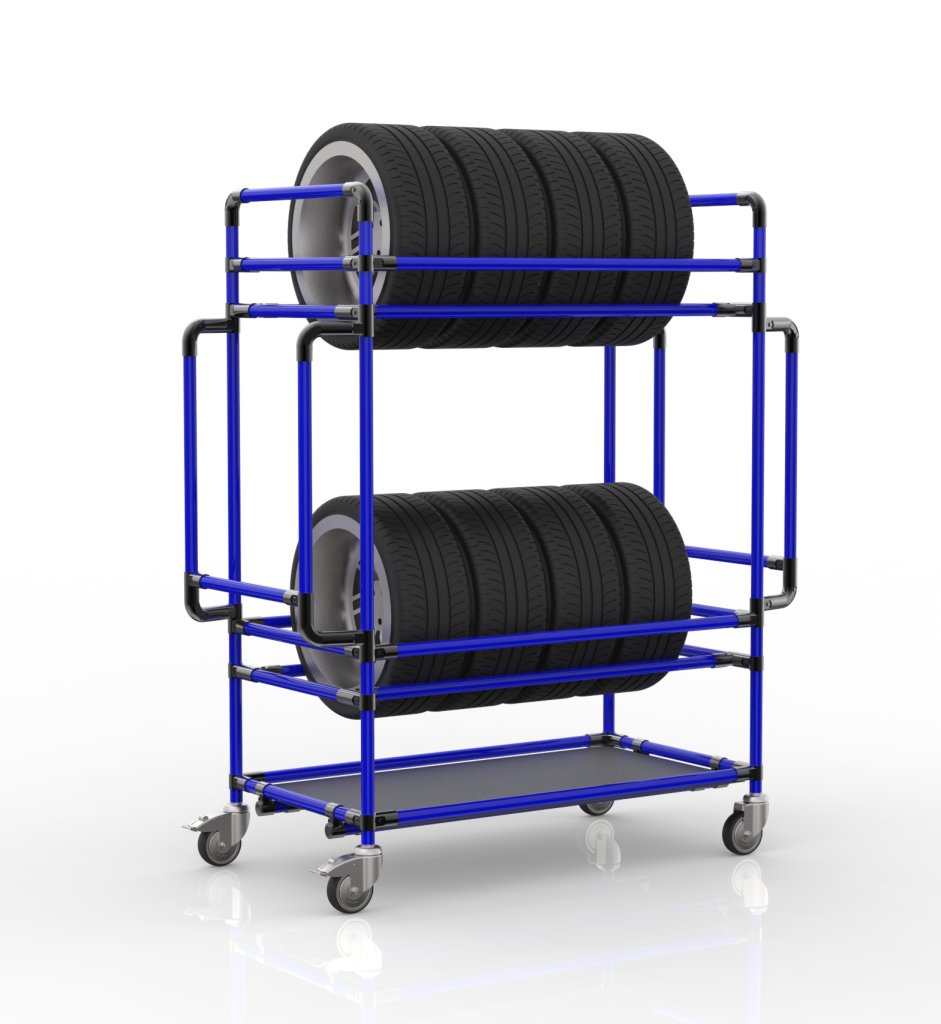 Pojazdný regál na pneumatiky z rúrkového stavebnicového systému s jednou policou a dvoma poschodiami. Ideálny pre pneumatiky o celý popis a parametre