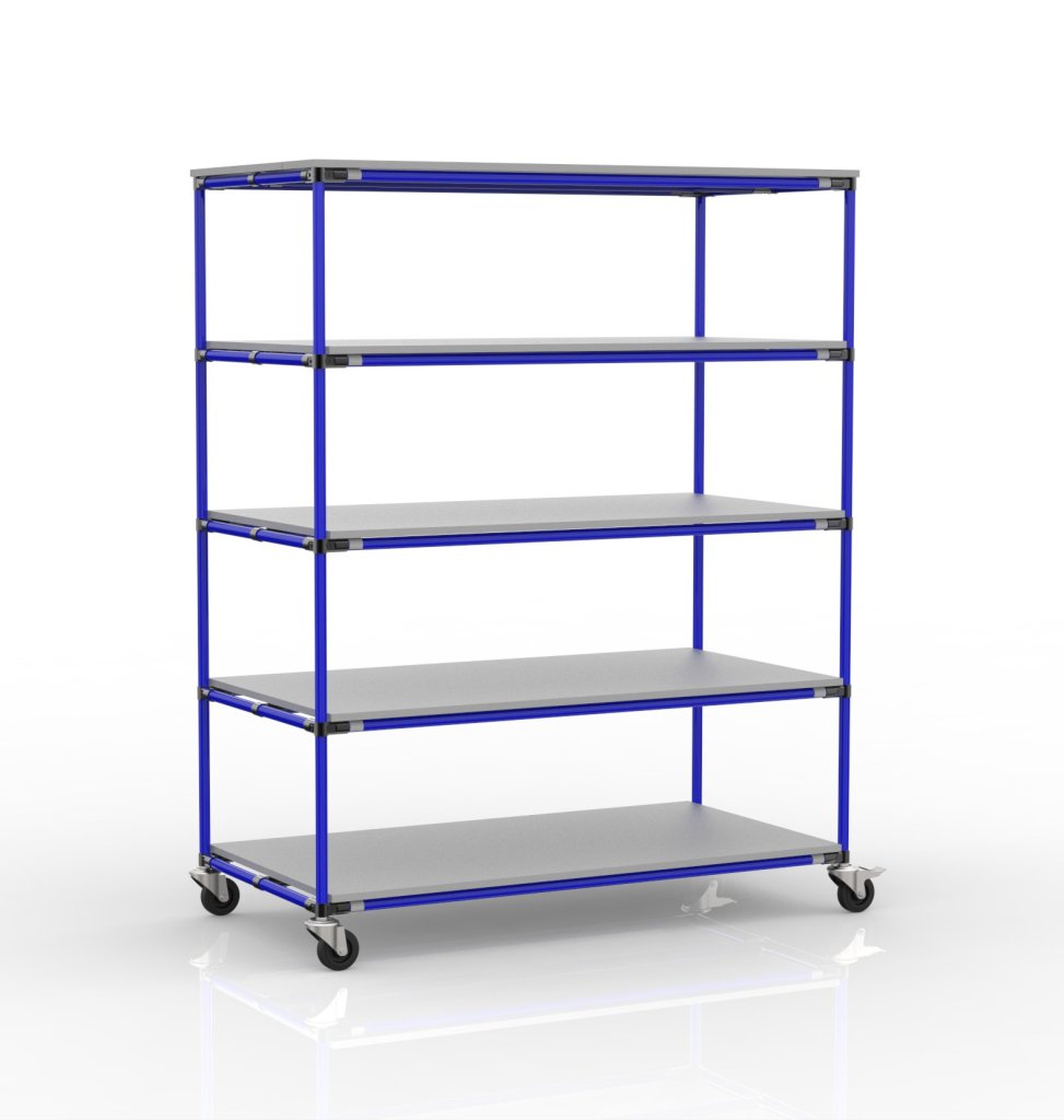 Policový regál s piatimi rovnými policami je praktickým pomocníkom pre manipuláciu vo výrobných firmách a logistických centrách, najmä v oblasti e-commerce. Súčasťou vozíka sú štyri otočné kolieska s priemerom 100 mm. Prednosťou týchto koliesok je nízky valivý odpor a vďaka tomu komfortná manipulácia. Konfiguráciu koliesok je možné zmeniť podľa požiadaviek zákazníka. Celková nosnosť 300 kg, nosnosť na polici 75 kg. Rozmery 1900 x 1505 x 755 mm.