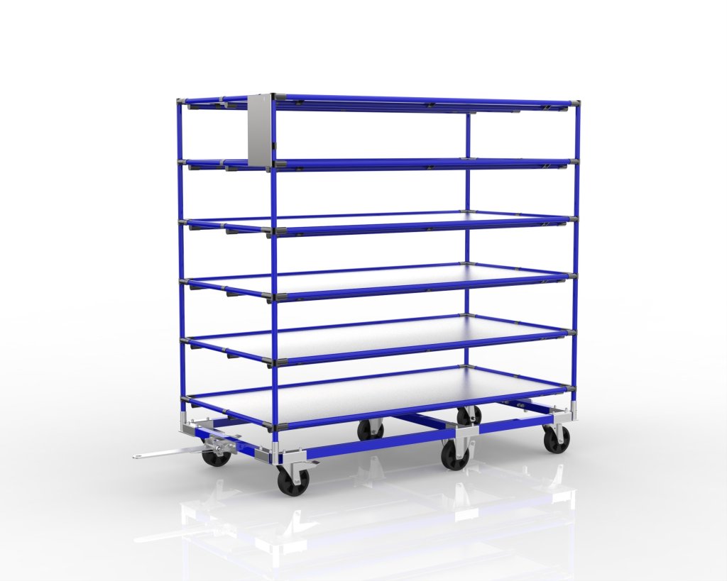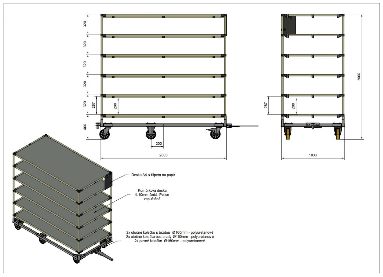 Policový vozík z jaklového podvozku s nadstavbou z rúrkového systému. Možnosť zapojenia viacerých vozíkov do vláčika. Vhodný na prepravu materiálu a produktov.