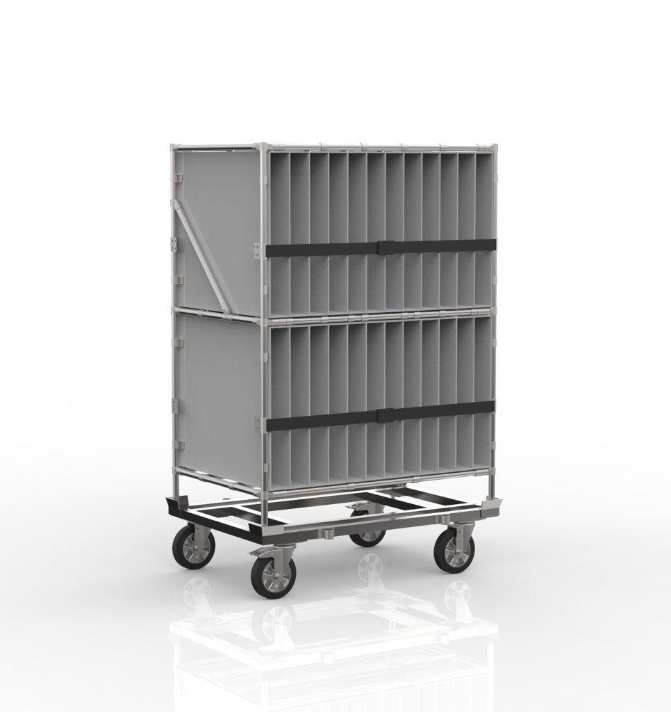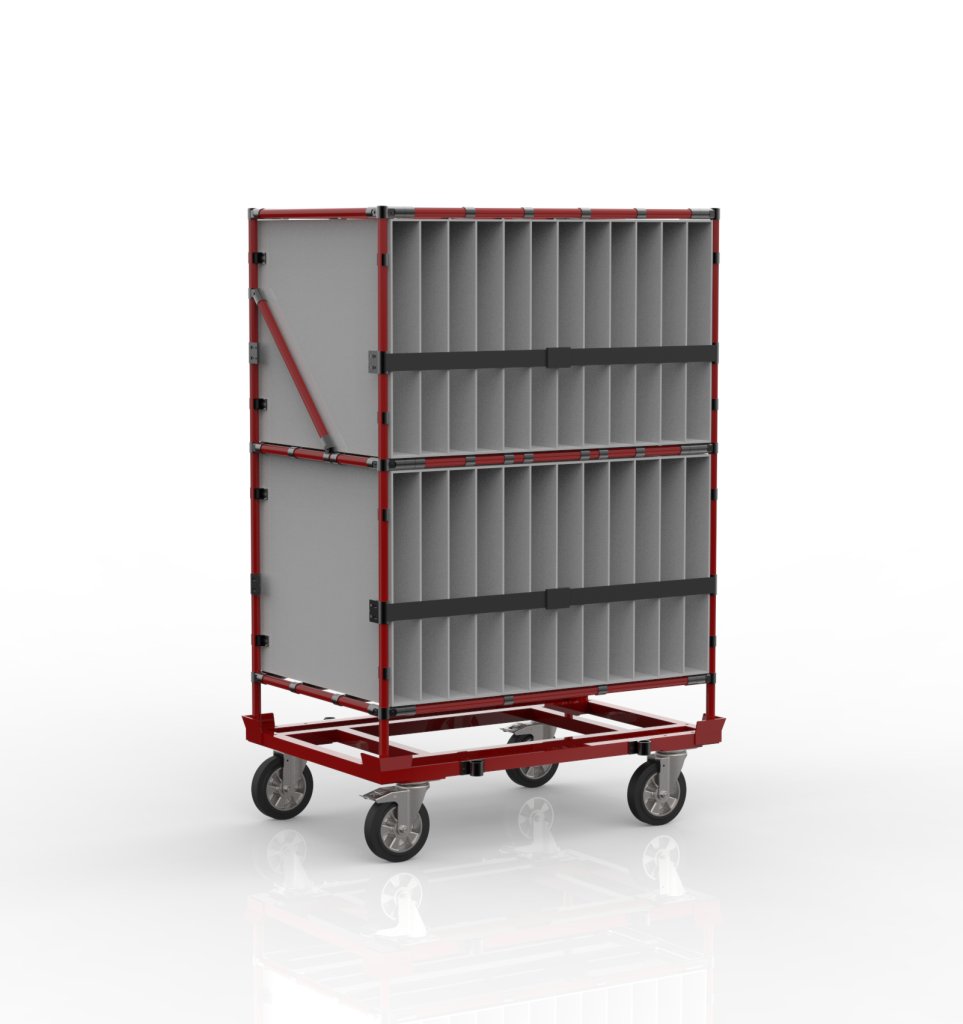 Zváraný vozík s nadstavbou z rúrkového systému. Základ vozíka tvorí zváraný oceľový rám s pozinkovaným povrchom, nadstavba je z rúrkového stavebnicového systému s laminovanou PP vložkou s vyberateľným dnom v každej priehradke, na bezpečné uloženie materiálu slúži upínací pás s okami na každej strane. Súčasťou sú aj dve otočné kolieska s brzdou a dve otočné kolieska bez brzdy s priemerom 200 mm. Nosnosť vozíka je 120 kg. Rozmery 1885 x 1203 x 803 mm.