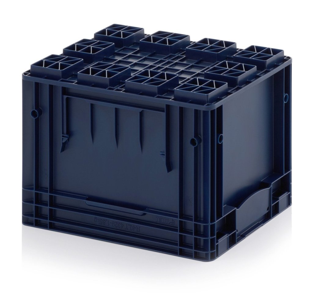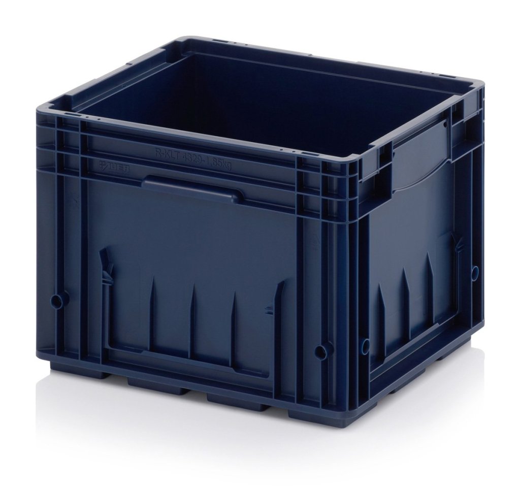 R-KLT prepravka vyrobená z kvalitného polypropylénu odolného voči olejom, tukom a väčšine kyselín a lúhov. Tepelná stálosť od -20° do 100° C, farba RAL 5003 modrá. Rrozmery v. 280 x š. 300 x hl. 400 mm. Extrémne stabilné kompozitné dno, nosnosť prepravky 20 kg, max. stohovacia nosnosť 600 kg.