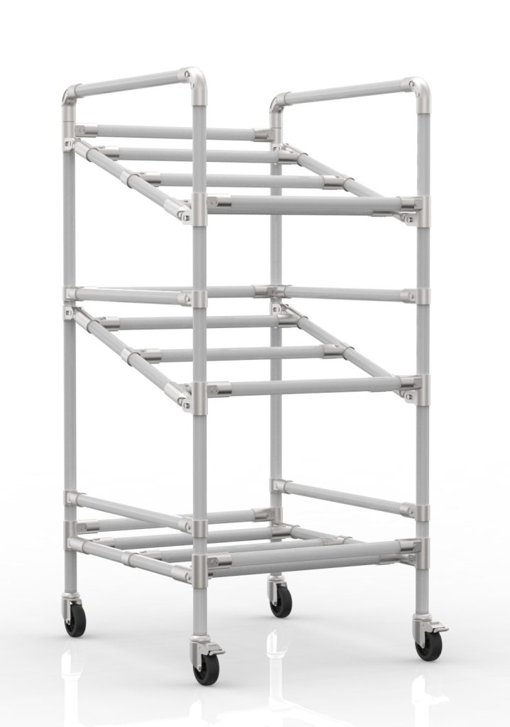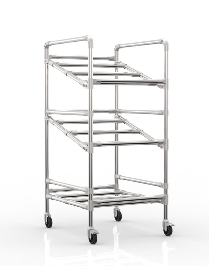 Regálový vozík na prepravky s jednou rovnou a dvoma šikmými policami je praktickým pomocníkom pre manipuláciu vo výrobných firmách a logistických centrach, najmä v oblasti e-commerce. Súčasťou vozíka sú dve otočné kolesá s brzdou s primerom 75 mm a dve otočné kolesá bez brzdy. Prednosťou týchto kolesiek je nízky valivý odpor a vďaka tomu komfortná manipulácia. Konfiguráciu kolesiek je možné zmeniť podľa požiadaviek zákazníka. Celková nosnosť 180 kg, nosnosť na polici 60 kg. Rozmery 1250 x 572 x 670 mm.
