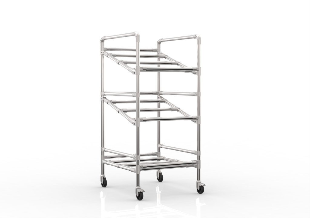 Regálový vozík na prepravky s jednou rovnou a dvoma šikmými policami je praktickým pomocníkom pre manipuláciu vo výrobných firmách a logistických centrach, najmä v oblasti e-commerce. Súčasťou vozíka sú dve otočné kolesá s brzdou s primerom 75 mm a dve otočné kolesá bez brzdy. Prednosťou týchto kolesiek je nízky valivý odpor a vďaka tomu komfortná manipulácia. Konfiguráciu kolesiek je možné zmeniť podľa požiadaviek zákazníka. Celková nosnosť 180 kg, nosnosť na polici 60 kg. Rozmery 1250 x 572 x 670 mm.