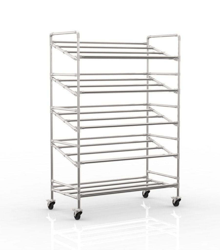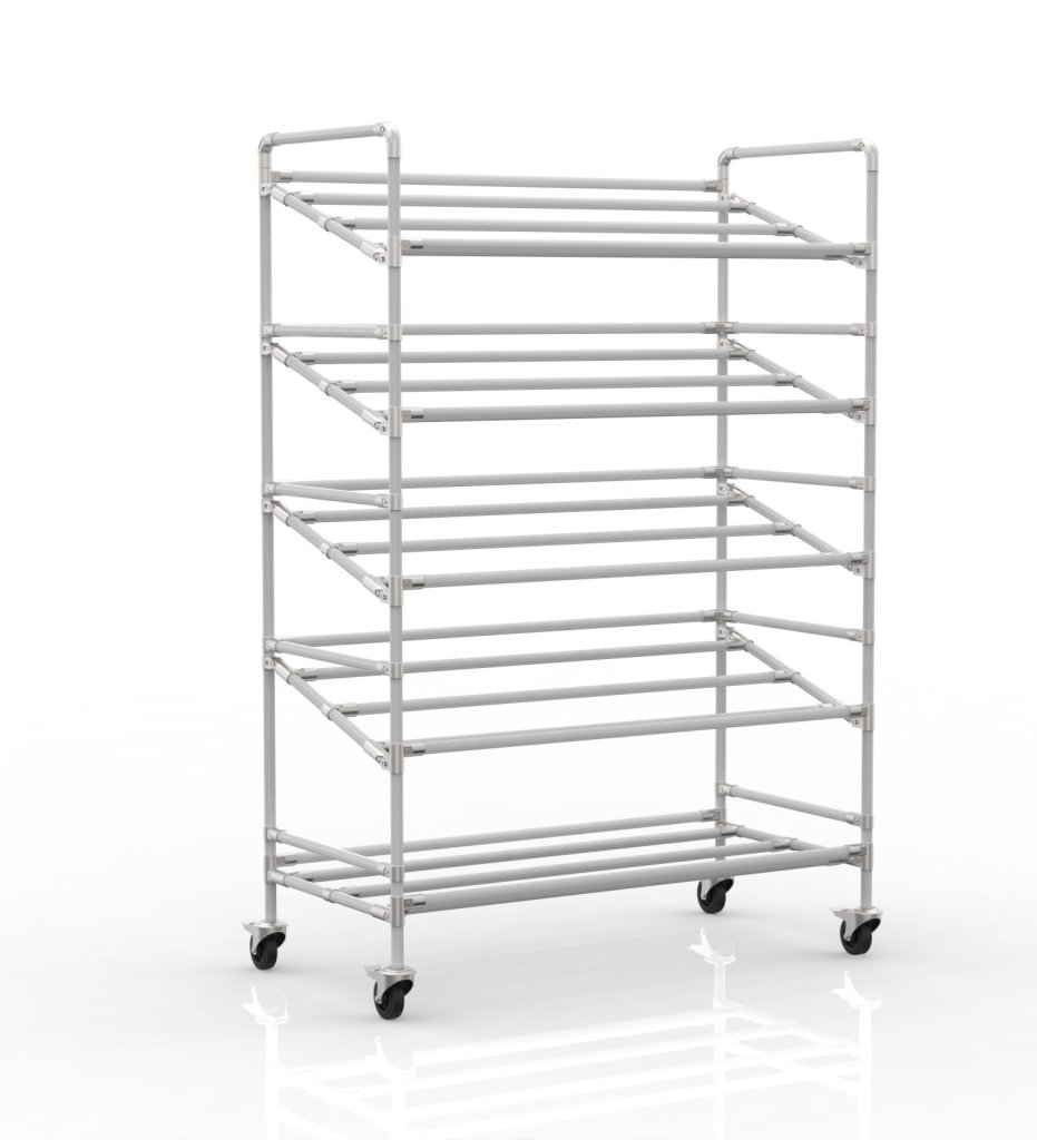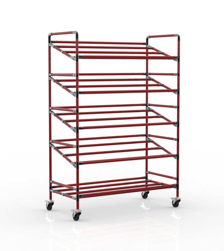 Regálový vozík na prepravky s jednou rovnou a štyrmi šikmými policami je praktickým pomocníkom pre manipuláciu vo výrobných firmách a logistických centrách, najmä v oblasti e-commerce.