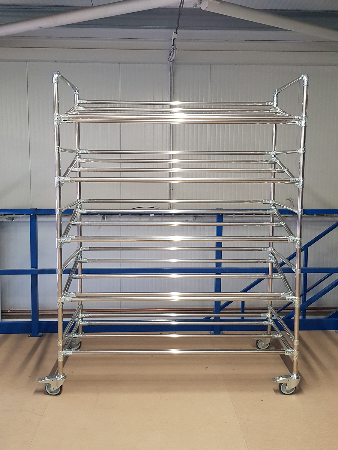 Súčasťou vozíka sú štyri otočné kolieska s brzdou s priemerom 100 mm. Prednosťou týchto koliesok je nízky valivý odpor a vďaka tomu komfortná manipulácia. Konfiguráciu koliesok je možné zmeniť podľa požiadaviek zákazníka. Celková nosnosť 300 kg, nosnosť na polici 60 kg. Rozmery 2038 x 1372 x 670 mm.