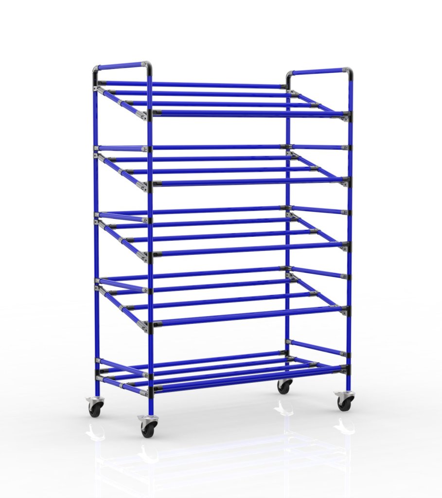 Regálový vozík na prepravky s jednou rovnou a štyrmi šikmými policami je praktickým pomocníkom pre manipuláciu vo výrobných firmách a logistických centrách, najmä v oblasti e-commerce.