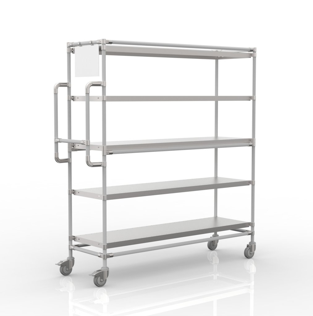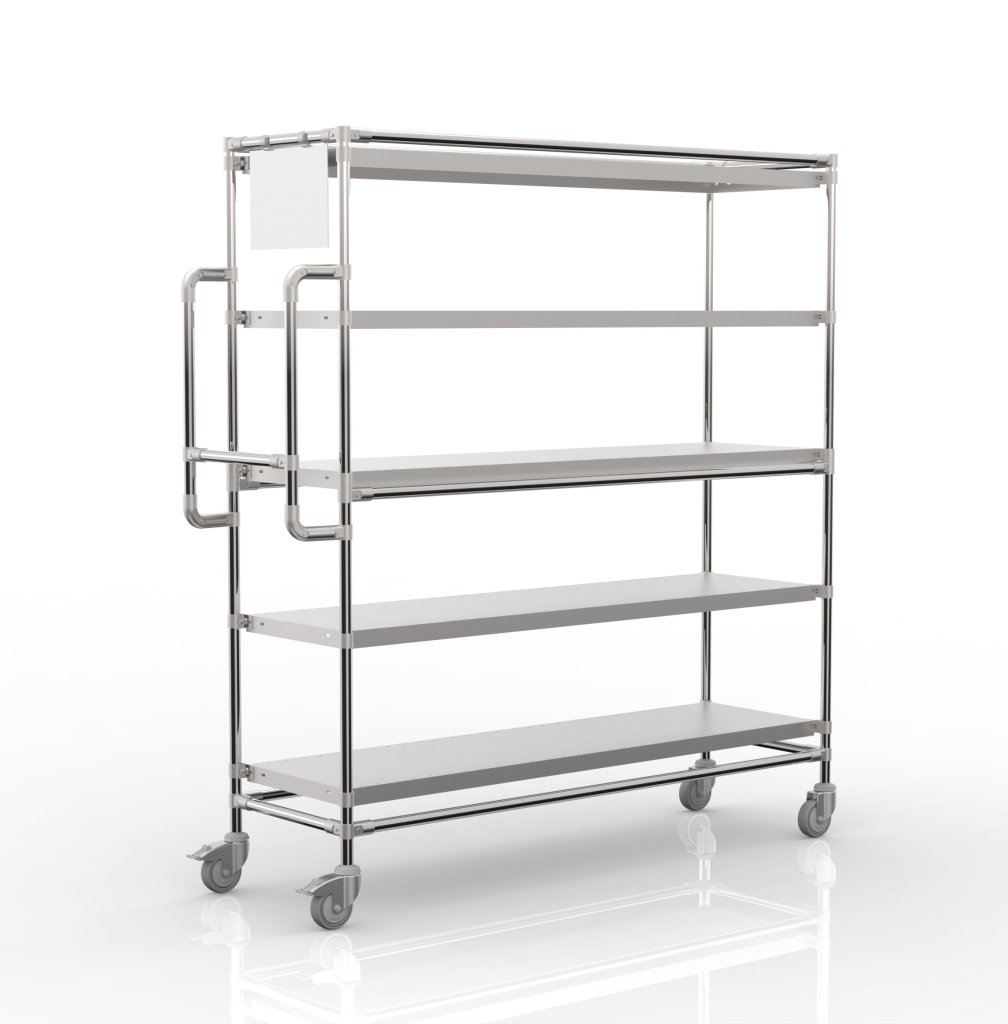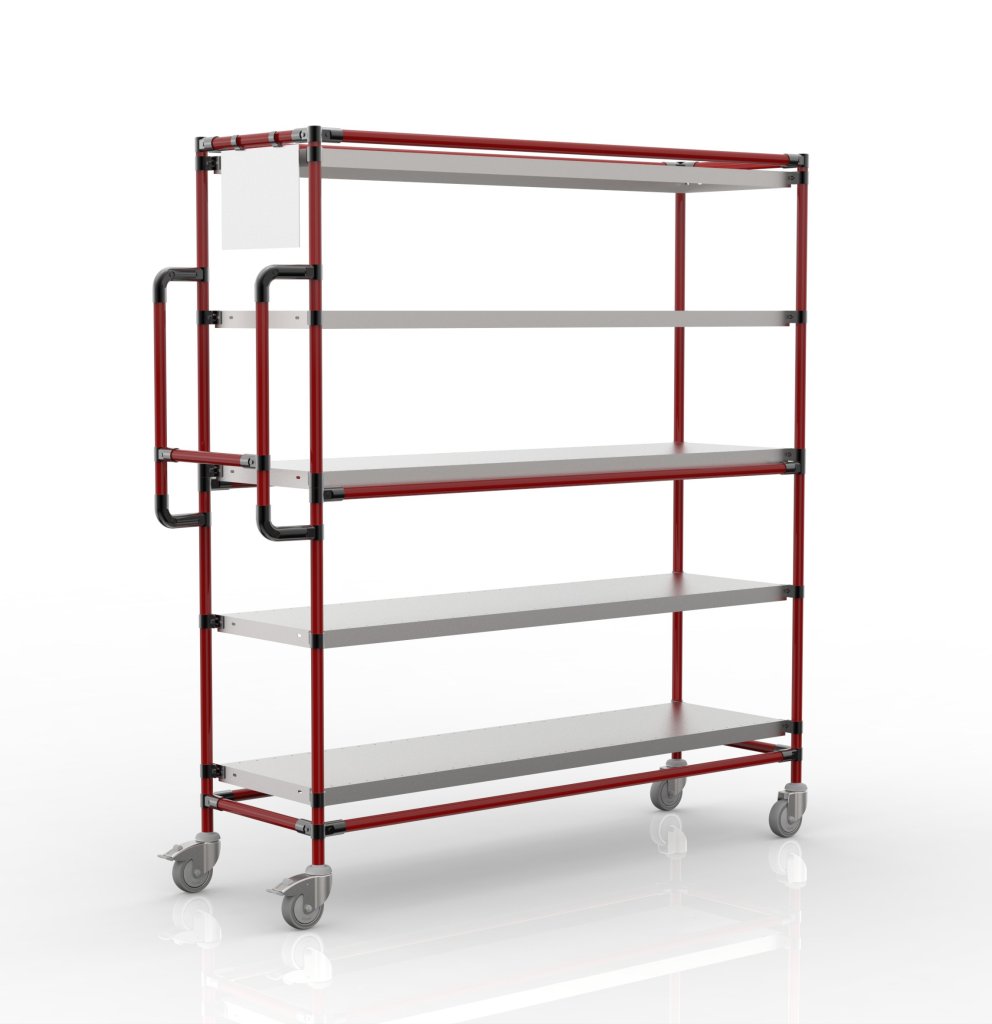 Súčasťou vozíka sú dve otočné kolieska s brzdou a dve otočné kolieska bez brzdy s priemerom 100 mm. Prednosťou týchto koliesok je nízky valivý odpor a vďaka tomu komfortná manipulácia. Konfiguráciu koliesok je možné zmeniť podľa požiadaviek zákazníka. Vozík je tiež vybavený ergonomickou rukoväťou pre ľahšiu a komfortnejšiu manipuláciu. Celková nosnosť 300 kg, nosnosť na polici 60 kg. Rozmery 1765 x 1566 x 482 mm.