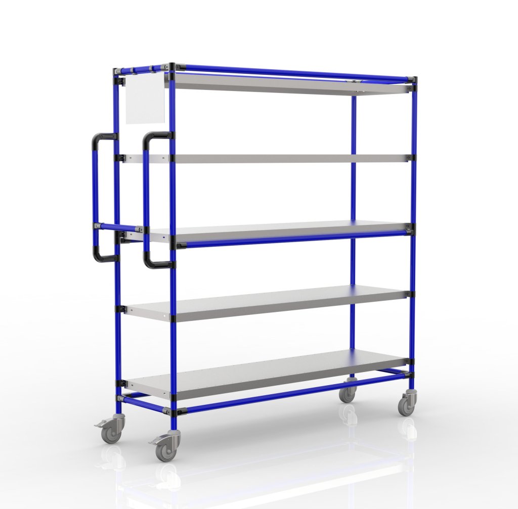 Súčasťou vozíka sú dve otočné kolieska s brzdou a dve otočné kolieska bez brzdy s priemerom 100 mm. Prednosťou týchto koliesok je nízky valivý odpor a vďaka tomu komfortná manipulácia. Konfiguráciu koliesok je možné zmeniť podľa požiadaviek zákazníka. Vozík je tiež vybavený ergonomickou rukoväťou pre ľahšiu a komfortnejšiu manipuláciu. Celková nosnosť 300 kg, nosnosť na polici 60 kg. Rozmery 1765 x 1566 x 482 mm.