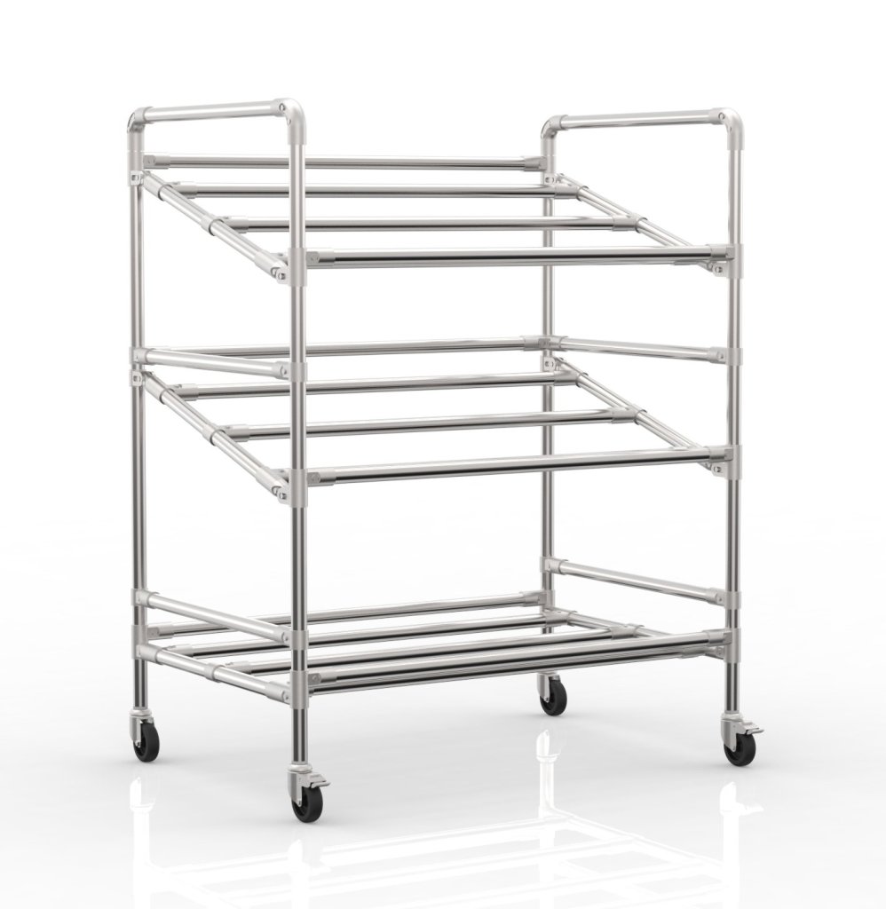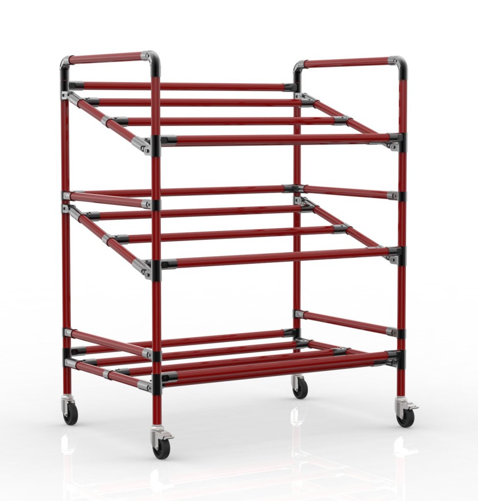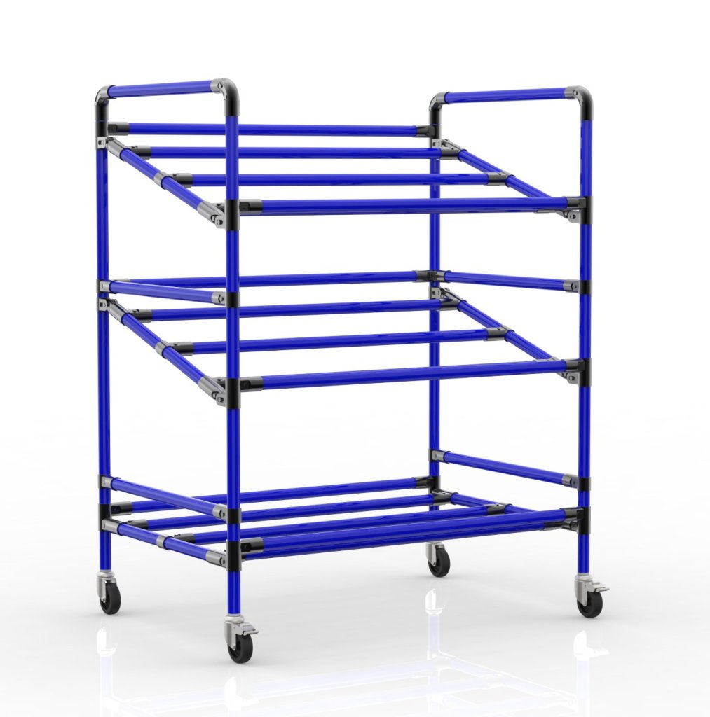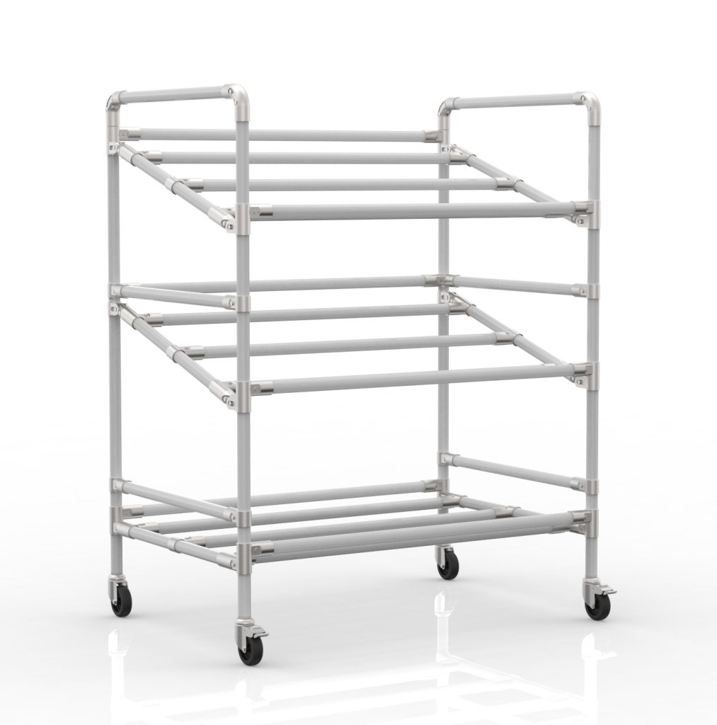 Regálový vozík na prepravky s jednou rovnou a dvoma šikmými policami je praktickým pomocníkom pre manipuláciu vo výrobných firmách a logistických centrach, najmä v oblasti e-commerce. Súčasťou vozíka sú dve otočné kolesá s brzdou s priemerom 75 mm a dve otočné kolesá bez brzdy. Prednosťou týchto kolesiek je nízky valivý odpor a vďaka tomu komfortná manipulácia. Konfiguráciu kolesiek je možné zmeniť podľa požiadaviek zákazníka. Celková nosnosť 180 kg, nosnosť na polici 60 kg. Rozmery 1250 x 972 x 670 mm.