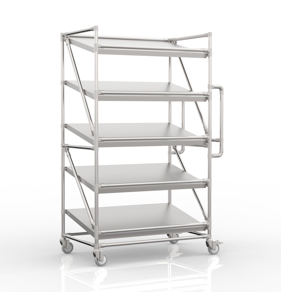 Súčasťou vozíka sú dve otočné kolieska s brzdou a dve otočné kolieska bez brzdy s priemerom 100 mm. Prednosťou týchto koliesok je nízky valivý odpor a vďaka tomu komfortná manipulácia. Konfiguráciu koliesok je možné zmeniť podľa požiadaviek zákazníka. Vozík je tiež vybavený ergonomickou rukoväťou pre ľahšiu a komfortnejšiu manipuláciu. Celková nosnosť 300 kg, nosnosť na polici 60 kg. Rozmery 1829 x 1066 x 667 mm.