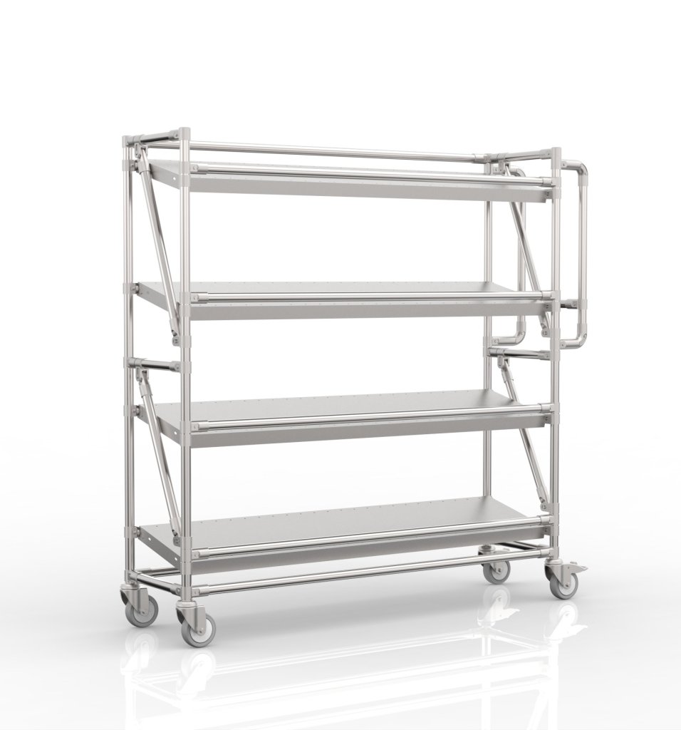 Súčasťou vozíka sú dve otočné kolieska s brzdou a dve otočné kolieska bez brzdy s priemerom 100 mm. Prednosťou týchto koliesok je nízky valivý odpor a vďaka tomu komfortná manipulácia. Konfiguráciu koliesok je možné zmeniť podľa požiadaviek zákazníka. Vozík je tiež vybavený ergonomickou rukoväťou pre ľahšiu a komfortnejšiu manipuláciu. Celková nosnosť 300 kg, nosnosť na polici 60 kg. Rozmery 1438 x 1361 x 374 mm.