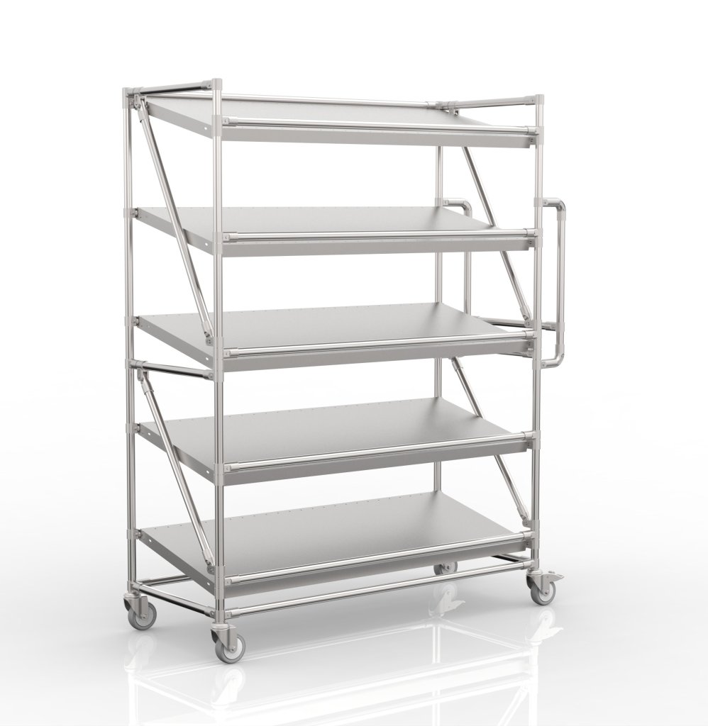Súčasťou vozíka sú dve otočné kolieska s brzdou a dve otočné kolieska bez brzdy s priemerom 100 mm. Prednosťou týchto koliesok je nízky valivý odpor a vďaka tomu komfortná manipulácia. Konfiguráciu koliesok je možné zmeniť podľa požiadaviek zákazníka. Vozík je tiež vybavený ergonomickou rukoväťou pre ľahšiu a komfortnejšiu manipuláciu. Celková nosnosť 300 kg, nosnosť na polici 60 kg. Rozmery 1807 x 1361 x 563 mm.