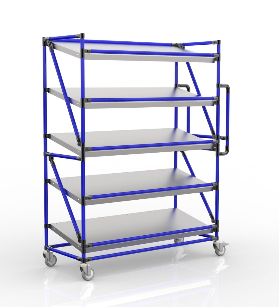 Regálový vozík na prepravky s piatimi šikmými policami je praktickým pomocníkom na manipuláciu vo výrobných firmách a logistických centrách.
