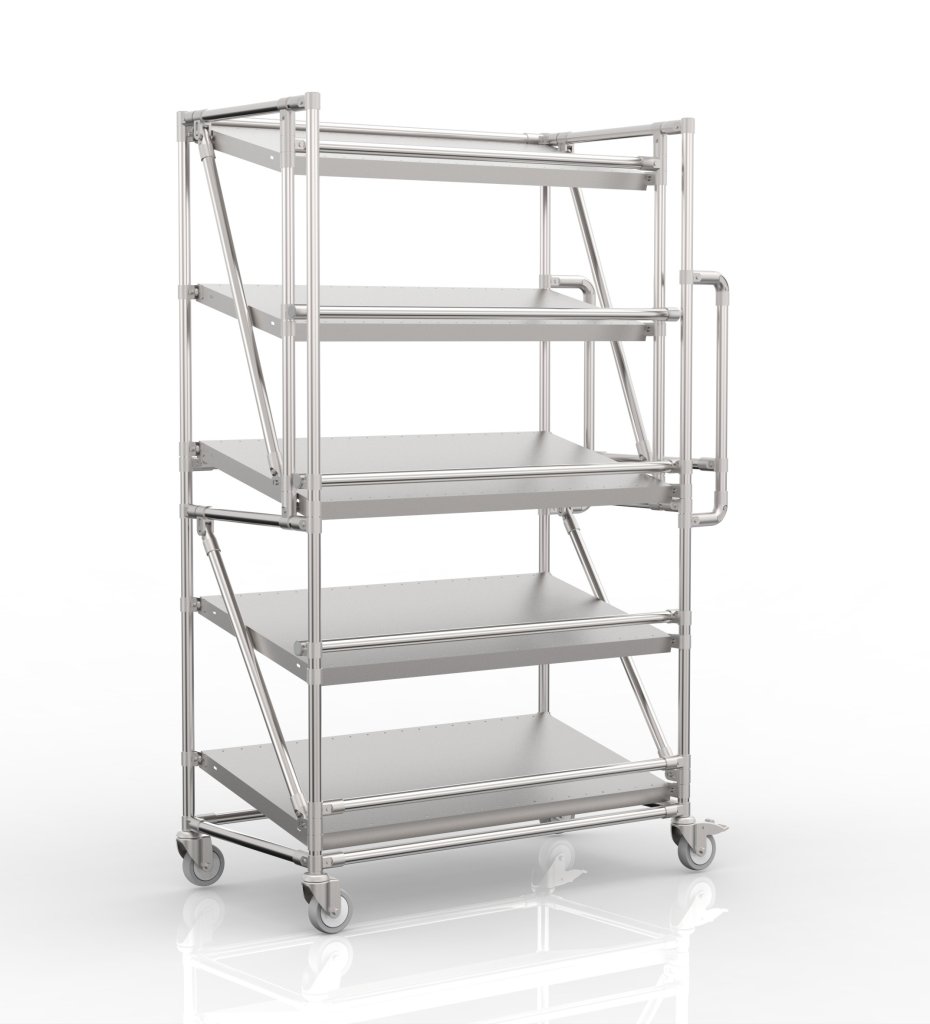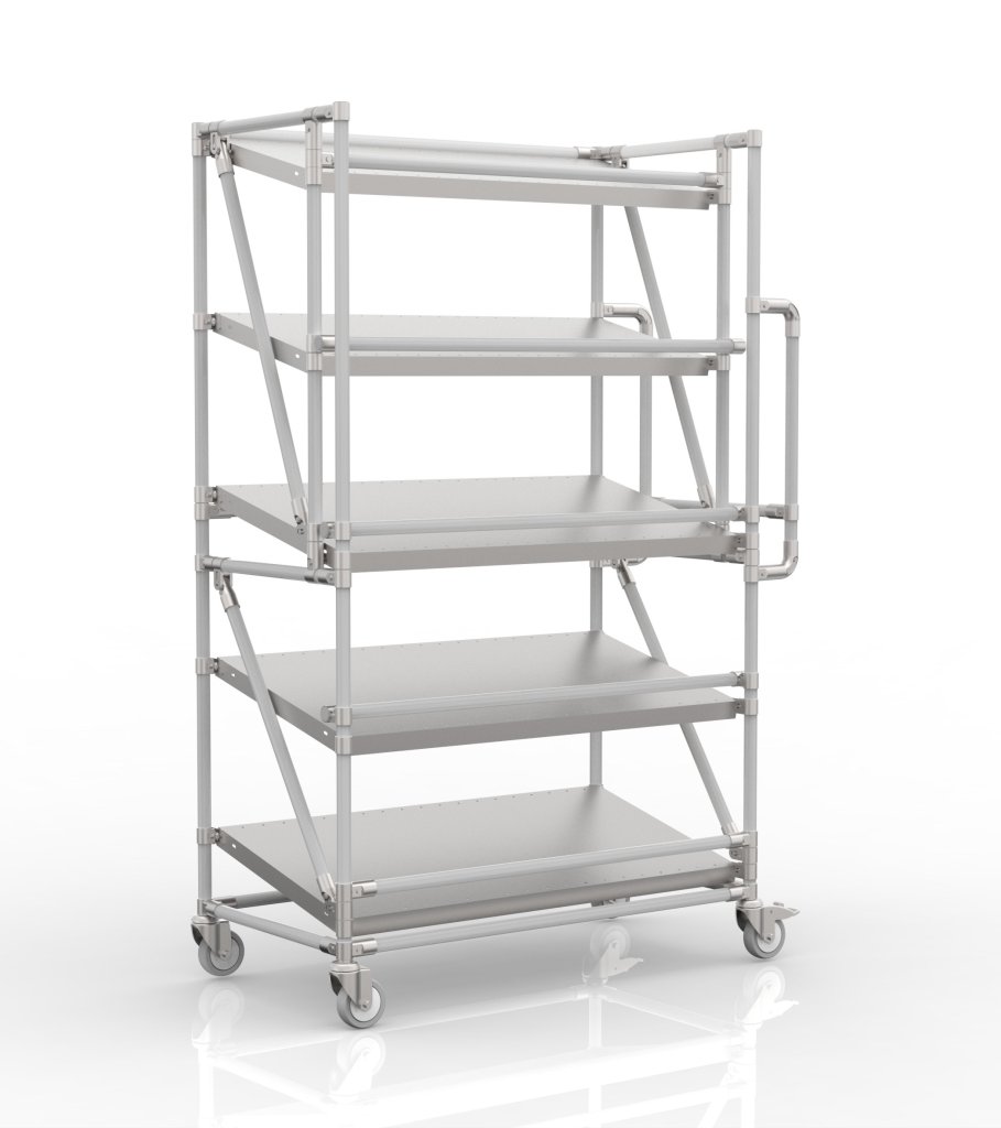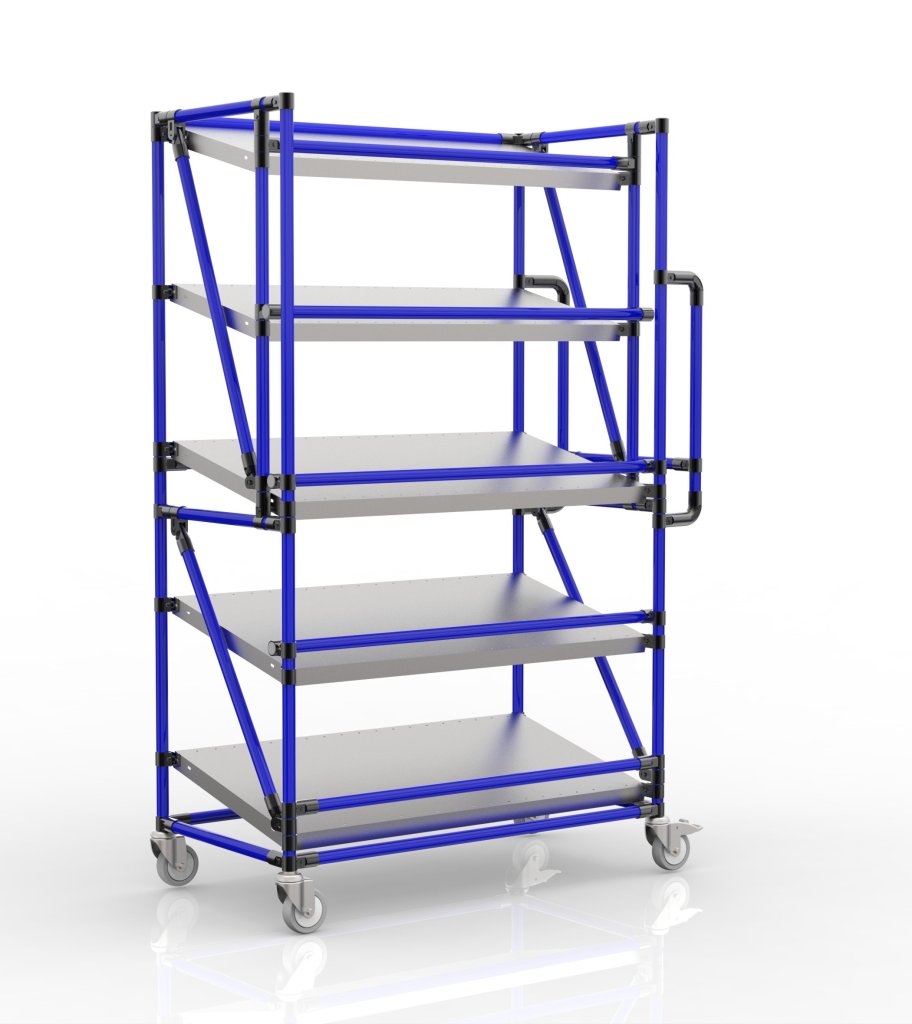 Regálový vozík na prepravky s piatimi šikmými policami je praktickým pomocníkom na manipuláciu vo výrobných firmách a logistických centrách. Súčasťou vozíka sú dve otočné kolieska s brzdou a dve otočné kolieska bez brzdy s priemerom 100 mm. Prednosťou týchto koliesok je nízky valivý odpor a vďaka tomu komfortná manipulácia. Konfiguráciu koliesok je možné zmeniť podľa požiadaviek zákazníka. Vozík je tiež vybavený ergonomickou rukoväťou pre ľahšiu a komfortnejšiu manipuláciu. Celková nosnosť 300 kg, nosnosť na polici 60 kg. Rozmery 1770 x 1059 x 567 mm.